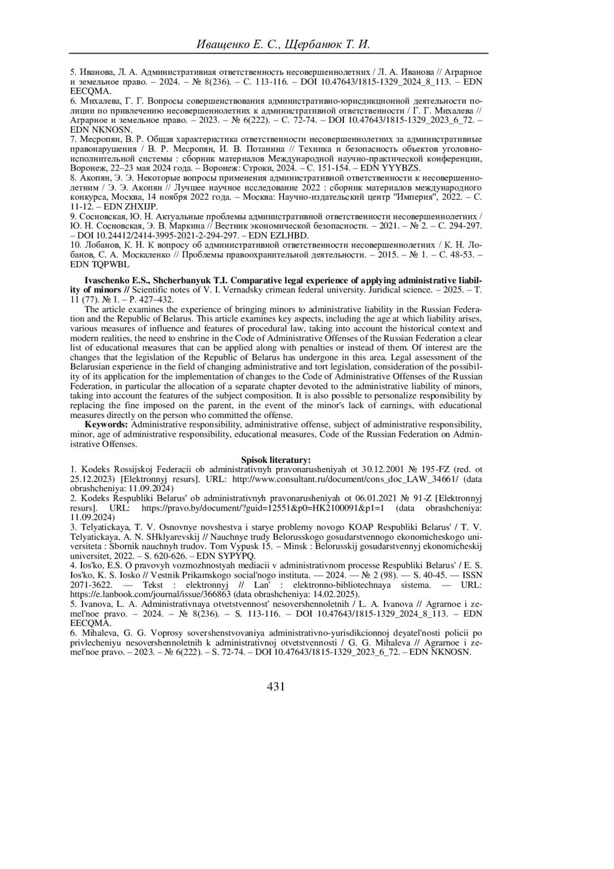 6. Михалева, Г. Г. Вопросы совершенствования административно-юрисдикционной деятельности полиции по привлечению несовершеннолетних к административной ответственности / Г. Г. Михалева // Аграрное и земельное право. - 2023. - № 6(222). - С. 72-74. -EDN. DOI: 10.47643/1815-1329_2023_6_72 EDN: NKNOSN