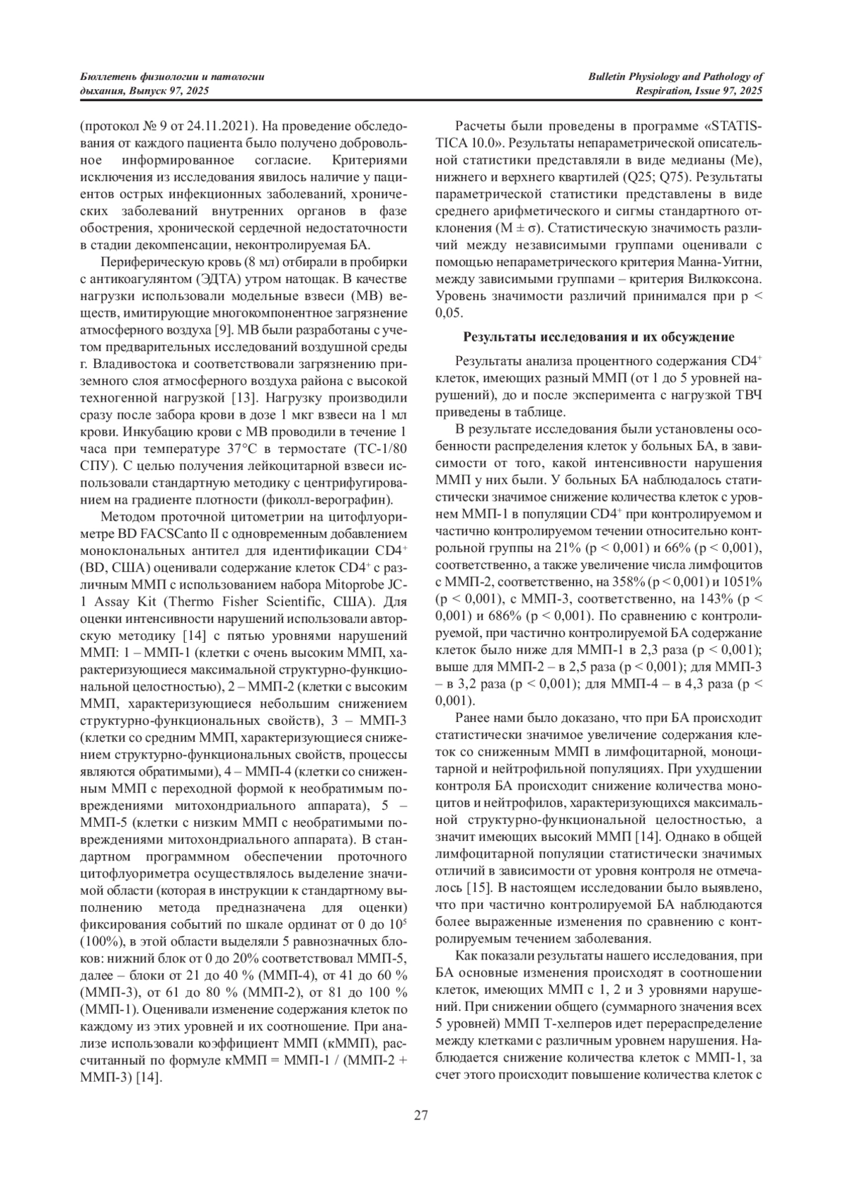 Введение. Патогенетические механизмы формирования бронхиальной астмы (БА) во многом основаны на процессах изменения энергетического состояния клеток (в том числе иммунной системы), большую роль в котором играет состояние митохондриального мембранного потенциала (ММП). Снижение последнего проявляется уже на ранних этапах развития БА и может являться одним из ключевых признаков ее течения. Течение и прогрессирование БА способны усугубляться под влиянием разных факторов, в том числе твердых взвешенных частиц (ТВЧ) атмосферного воздуха. Однако сведения об изменении ММП в отдельных лимфоцитарных субпопуляциях при БА под воздействием ТВЧ практически отсутствуют. Цель. Установление нарушений мембранного потенциала митохондрий CD4+ клеток больных бронхиальной астмой легкой степени тяжести под воздействием ТВЧ приземного слоя атмосферного воздуха. Материалы и методы. В исследование in vitro были включены образцы периферической крови 131 больных БА и 60 условно здоровых лиц. В качестве нагрузки при проведении эксперимента использовали модельные взвеси веществ, имитирующие многокомпонентное загрязнение атмосферного воздуха г. Владивостока. Уровни интенсивности нарушений ММП (от 1 до 5) CD4+ определяли методом проточной цитофлуориметрии. При анализе использовали коэффициент ММП (кММП). Результаты. При БА основные перестройки процентного соотношения лимфоцитарной субпопуляции происходили среди клеток, имеющих уровни ММП-1, ММП-2 и ММП-3: наблюдалось уменьшение количества клеток с высоким ММП и увеличение числа CD4+, характеризующихся снижением структурно-функциональных свойств (ММП-2 и ММП-3). Воздействие ТВЧ вызывало перераспределение клеток между уровнями ММП у больных БА. При снижении контроля БА были установлены более выраженные нарушения энергетического состояния клеток. У больных при контролируемом течении БА по сравнению с частично контролируемом кММП был ниже на 82,9%. При воздействии ТВЧ на больных БА кММП снижался относительно групп без нагрузки на 27,2% и 16,3% при контролируемом и частично контролируемом течении соответственно. Заключение. Установлены особенности нарушения мембранного потенциала митохондрий CD4+ клеток больных бронхиальной астмой легкой степени тяжести под воздействием ТВЧ приземного слоя атмосферного воздуха в зависимости от уровня контроля заболевания. Оценка перераспределения уровней ММП и коэффициента ММП как интегрального показателя энергетического состояния CD4+ клеток может способствовать раннему выявлению нарушений энергетического обмена при БА, что позволит оптимизировать профилактику прогрессирования патологии.