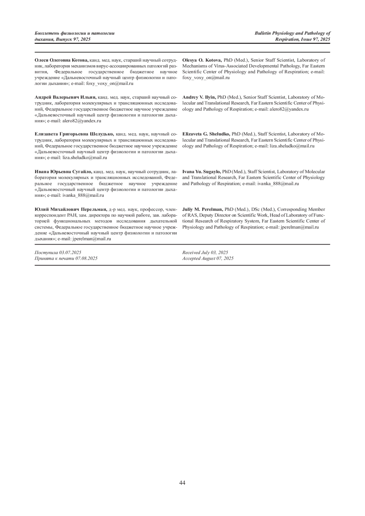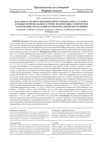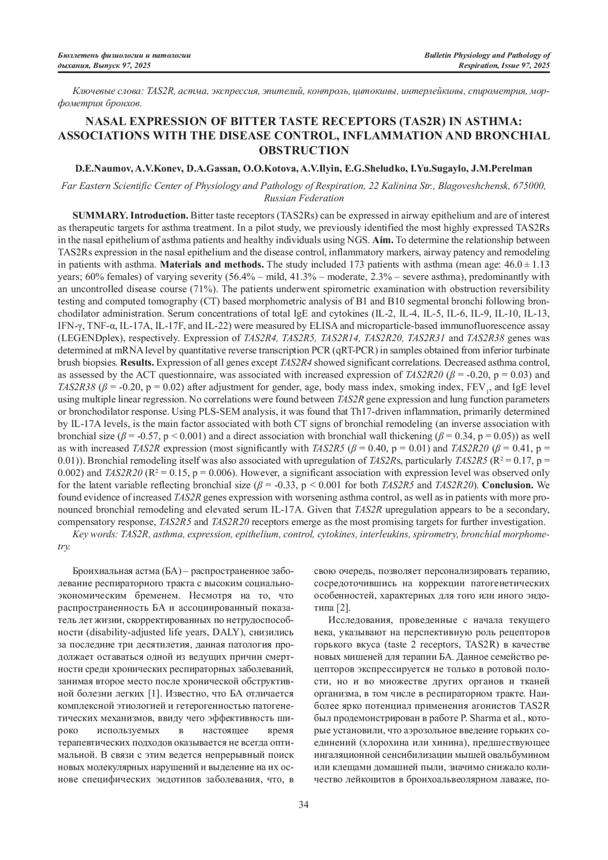 4. Наумов Д.Е., Гассан Д.А., Котова О.О., Шелудько Е.Г., Афанасьева Е.Ю., Конев А.В., Перельман Ю.М. Анализ экспрессии рецепторов горького вкуса TAS2R в назальном эпителии больных бронхиальной астмой методом секвенирования нового поколения // Бюллетень физиологии и патологии дыхания. 2025. Вып.95. С.8-17. DOI: 10.36604/1998-5029-2025-95-8-17