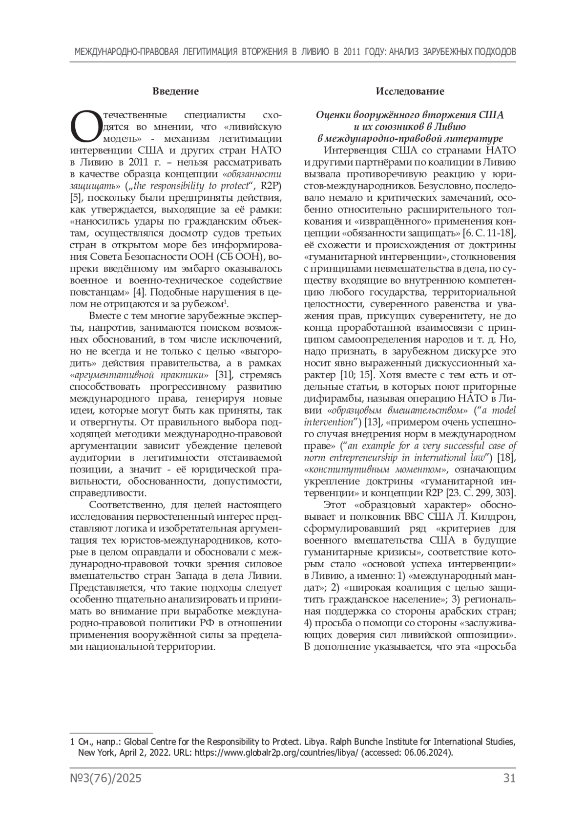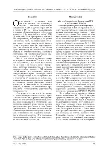 Введение. Анализ международно-правовых оценок механизма легитимации интервенции США и других стран НАТО в Ливию в 2011 г. свидетельствует о неоднозначном восприятии в научно-исследовательских кругах оснований силового вмешательства стран Запада в дела североафриканского государства. Особый интерес представляют логика и аргументация тех правоведов, которые сочли допустимым оправдать с международно-правовой точки зрения это вооружённое вторжение.