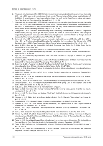 25. Teimouri H., Subedi S.P. Responsibility to Protect and the International Military Intervention in Libya in International Law: What Went Wrong and What Lessons Could Be Learnt from It? // Journal of Conflict and Security Law. 2018. Vol. 23. No. 1. P. 3-32.