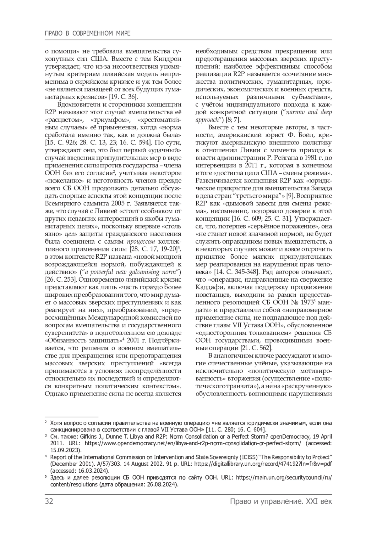 4. Геворгян К.Г. К читателю «Международной жизни». Концепция «ответственность по защите». Заключение Международно-правового совета при МИД России // Международная жизнь. 2013. № 8. С. 71-84.