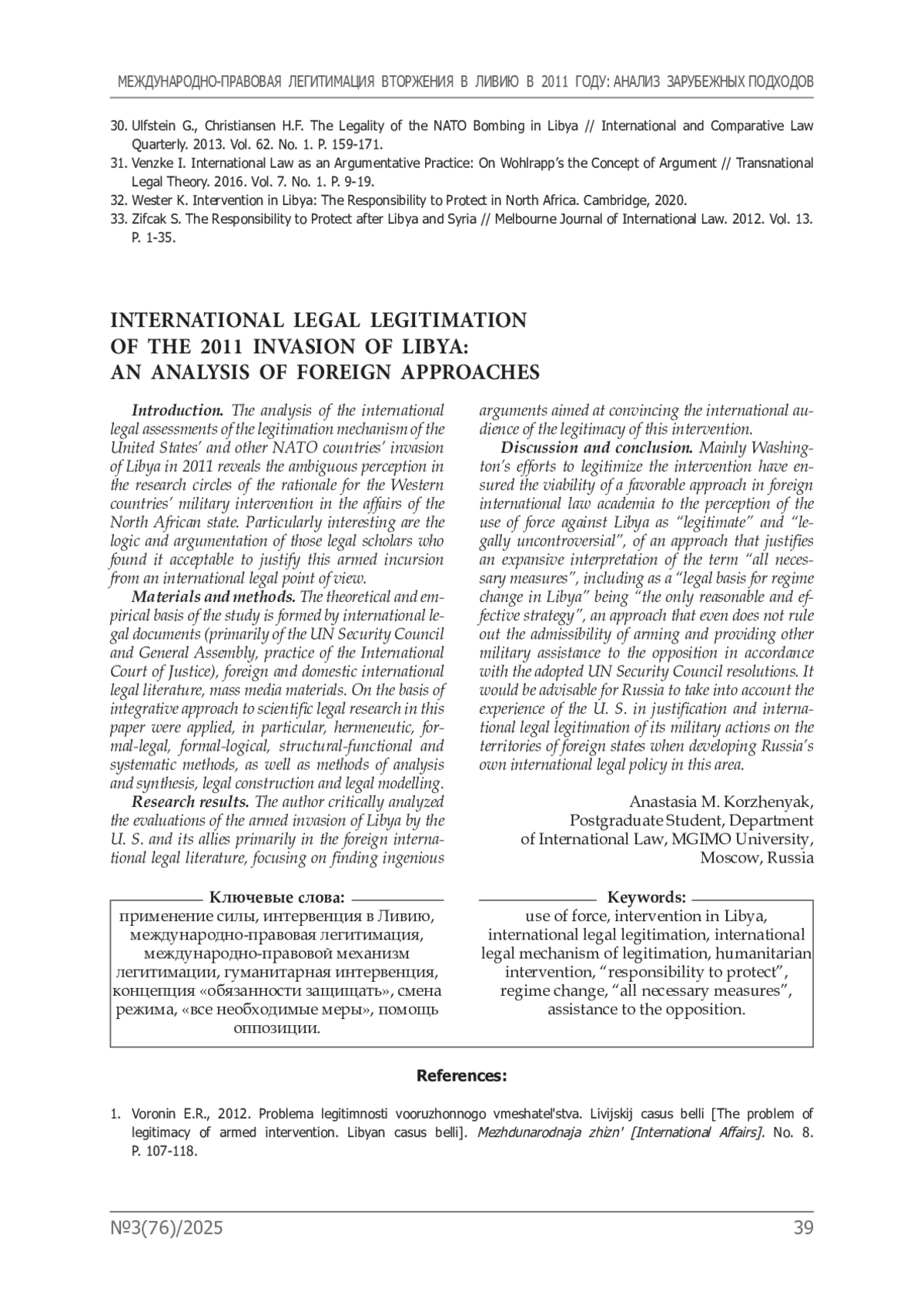 30. Ulfstein G., Christiansen H.F. The Legality of the NATO Bombing in Libya // International and Comparative Law Quarterly. 2013. Vol. 62. No. 1. P. 159-171.