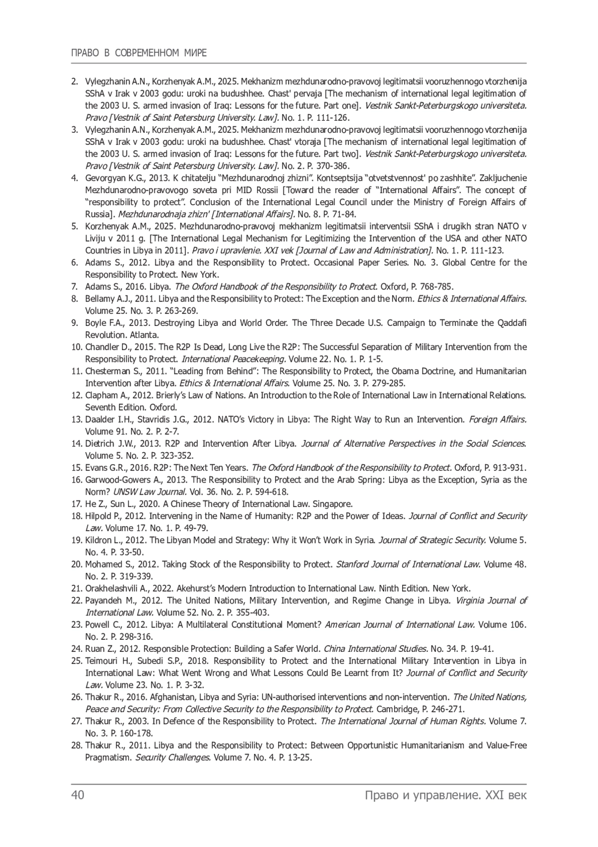 5. Корженяк А.М. Международно-правовой механизм легитимации интервенции США и других стран НАТО в Ливию в 2011 г. // Право и управление. XXI век. 2025. № 1. С. 111-123.