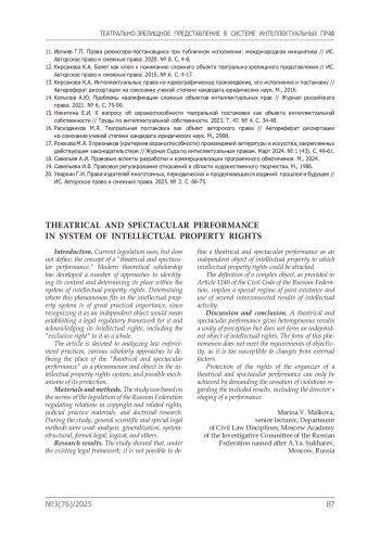 15. Никитина Е.И. К вопросу об охраноспособности театральной постановки как объекта интеллектуальной собственности // Труды по интеллектуальной собственности. 2023. Т. 47. № 4. С. 34-40.