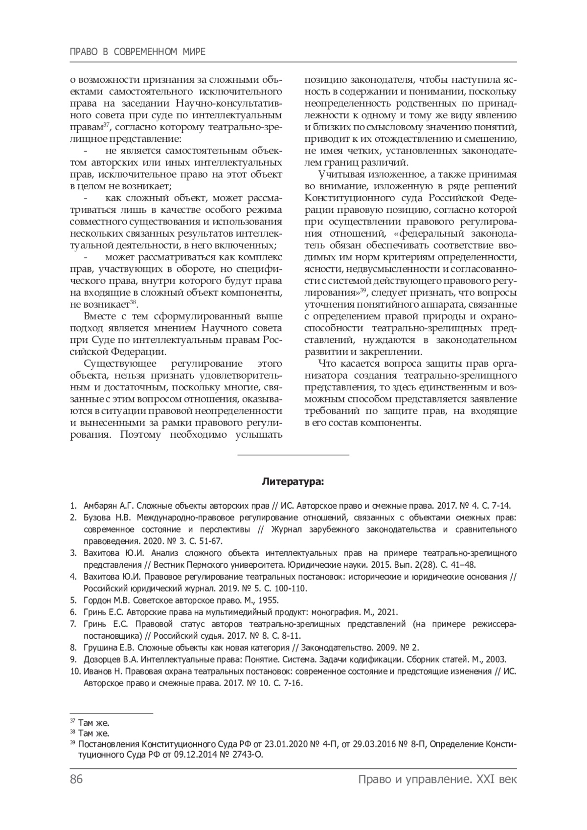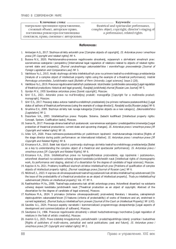 10. Иванов Н. Правовая охрана театральных постановок: современное состояние и предстоящие изменения // ИС. Авторское право и смежные права. 2017. № 10. С. 7-16