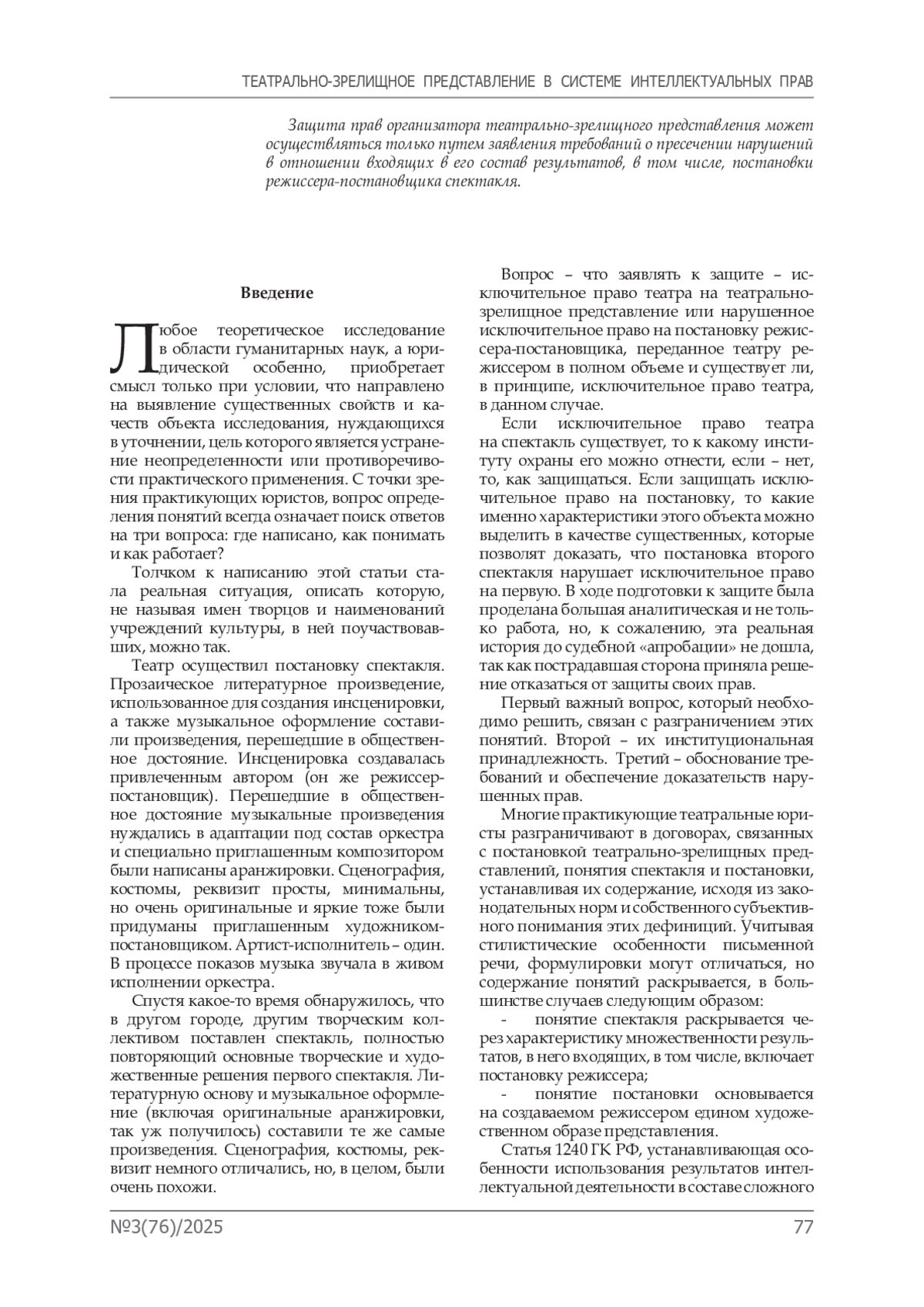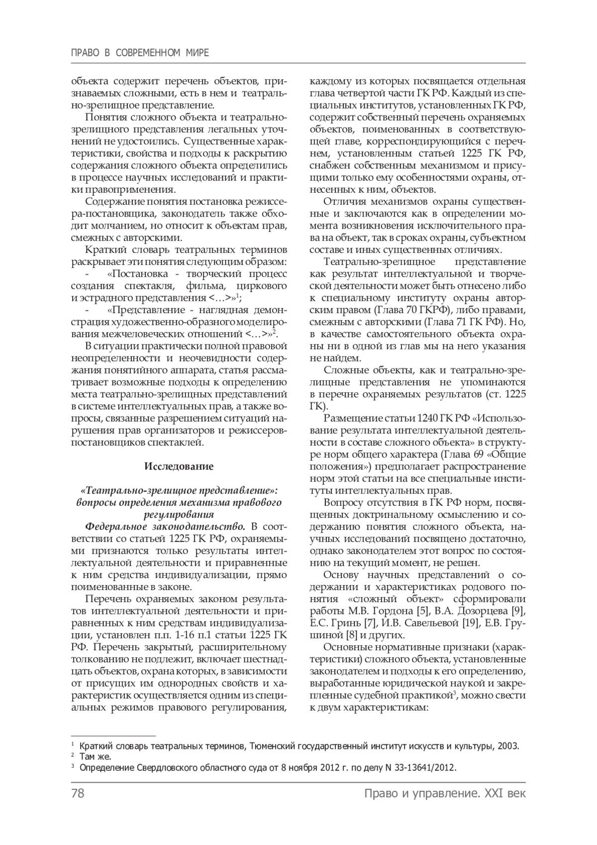 Результаты исследования. Исследование показало, что в условиях существующего нормативно-правового регулирования, невозможно определить театрально-зрелищное представление в качестве самостоятельного объекта интеллектуальной собственности, за которым в целом могут признаваться интеллектуальные права. Содержание понятия «сложный объект» статьи 1240 ГК РФ означает особый режим совместного существования и использования нескольких связанных результатов интеллектуальной деятельности.