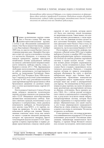 Обсуждение и заключение. Попытки трансформации российского политического сознания, игнорирующие сложившиеся исторические, социокультурные реалии при построении партийной системы, на сегодняшний день не приносят ожидаемых результатов. Более того, ориентация на западные шаблоны уже не раз подрывала стабильность и единство России, что означает вероятность возникновения нового кризиса в будущем, если страна откажется от формирования своего подхода к управлению в политике. Необходимо начать обсуждение возможностей создания новой архитектуры законодательной власти в корне отличной от моделей иной нам Западной цивилизации.