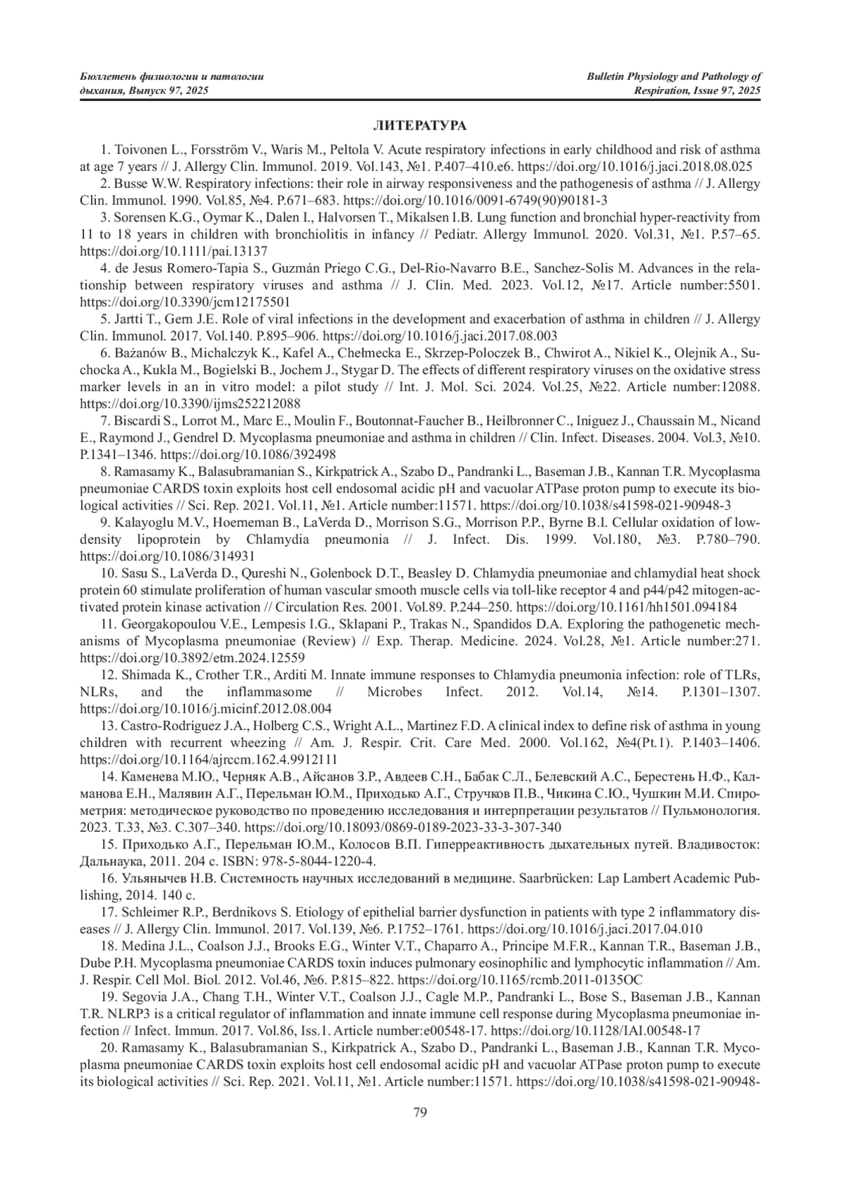 3. Sorensen K.G., Oymar K., Dalen I., Halvorsen T., Mikalsen I.B. Lung function and bronchial hyper-reactivity from 11 to 18 years in children with bronchiolitis in infancy // Pediatr. Allergy Immunol. 2020. Vol.31, №1. P.57-65. DOI: 10.1111/pai.13137