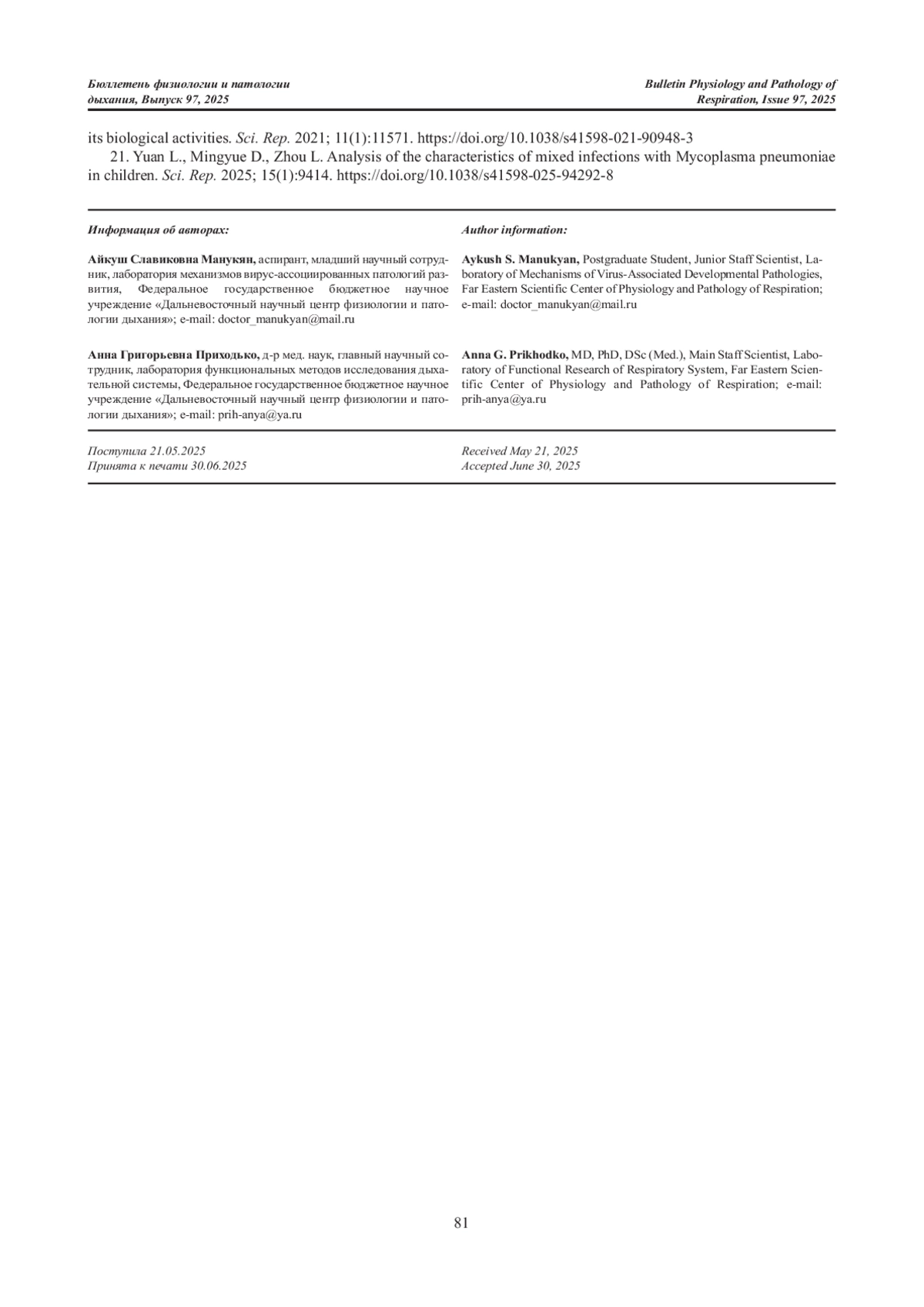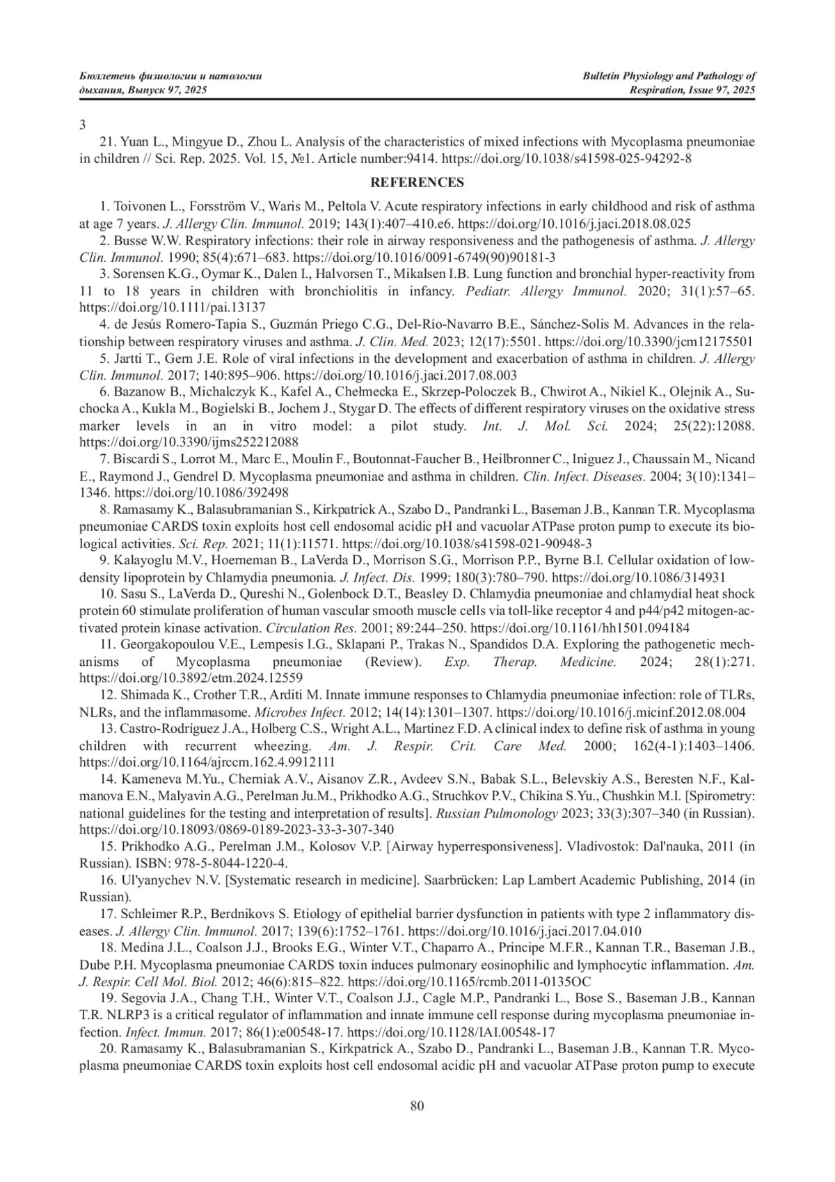 21. Yuan L., Mingyue D., Zhou L. Analysis of the characteristics of mixed infections with Mycoplasma pneumoniae in c hildren // Sci. Rep. 2025. Vol. 15, №1. Article number:9414.