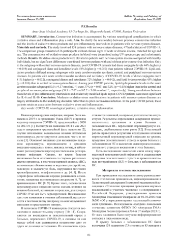 Введение. Коронавирусная инфекция сопровождается разнообразными осложнениями со стороны нервной системы, в развитии которых определенная роль принадлежит окислительному стрессу и воспалению. Цель – выяснение связи между перенесенной коронавирусной инфекцией и содержанием продуктов окислительного стресса и провоспалительных интерлейкинов у больных с заболеваниями нервной системы. Материалы и методы. В исследовании приняли участие 158 больных с заболеваниями нервной системы. Из них 47 имели в анамнезе COVID-19. Контрольную группу составили 26 человек без клинических признаков острых и хронических заболеваний, сопоставимых по возрасту и полу. Концентрацию в крови неокисленных и окисленных форм липидов определяли с помощью УФ-спектроскопии, содержание гидроперекисей липидов и витамина Е – колориметрическим методом. Результаты. Содержание продуктов окислительного стресса в крови больных с заболеваниями нервной системы увеличено по отношению к здоровым людям, но значимых различий между пациентами, перенесшими коронавирусную инфекцию и не переболевшими ею, не было выявлено. Только в подгруппе больных с заболеваниями центральной нервной системы у перенесших коронавирусную инфекцию по отношению к пациентам, не имеющим ее в анамнезе, на 44% было выше содержание диеновых коньюгатов (p = 0,019), и на 56% – коньюгированных диенов и кетодиенов (р = 0,050). Содержание в крови продуктов окисления липидов различалось между подгруппами больных с острыми нарушениями мозгового кровообращения, заболеваниями центральной и периферической нервной системы. У больных с острыми нарушениями мозгового кровообращения, не имеющих в анамнезе COVID-19, по отношению к больным с заболеваниями центральной нервной системы содержание диеновых коньюгатов было выше на 81% (р = 0,032), коньюгированных диенов и кетодиенов – на 72% (0,042), а гидроперекисей липидов – на 45% (р = 0,016). У больных, перенесших COVID-19, уровень гидроперекисей липидов в подгруппе с острыми нарушениями мозгового кровообращения (80,0 ± 9,37 нмоль/мл) был выше на 37% (р = 0,03) и 32% (р = 0,03) по отношению к подгруппам с заболеваниями центральной и периферической нервной системы, в которых он составил 59,9 ± 7,07 нмоль/мл и 62,2 ± 3,6 нмоль/мл, соответственно. Сильные корреляции между уровнем в крови провоспалительных интерлейкинов и окислительно модифицированных липидов у больных, перенесших COVID-19, наиболее характерны для интерлейкинов 6 и 10. Заключение. Умеренные проявления окислительного стресса у больных с заболеваниями нервной системы в значительной мере обусловлены основным заболеванием, а не перенесенной коронавирусной инфекцией. В постковидном периоде у обследованных больных, переболевших COVID-19, сохраняется связь между проявлениями окислительного стресса и воспаления.