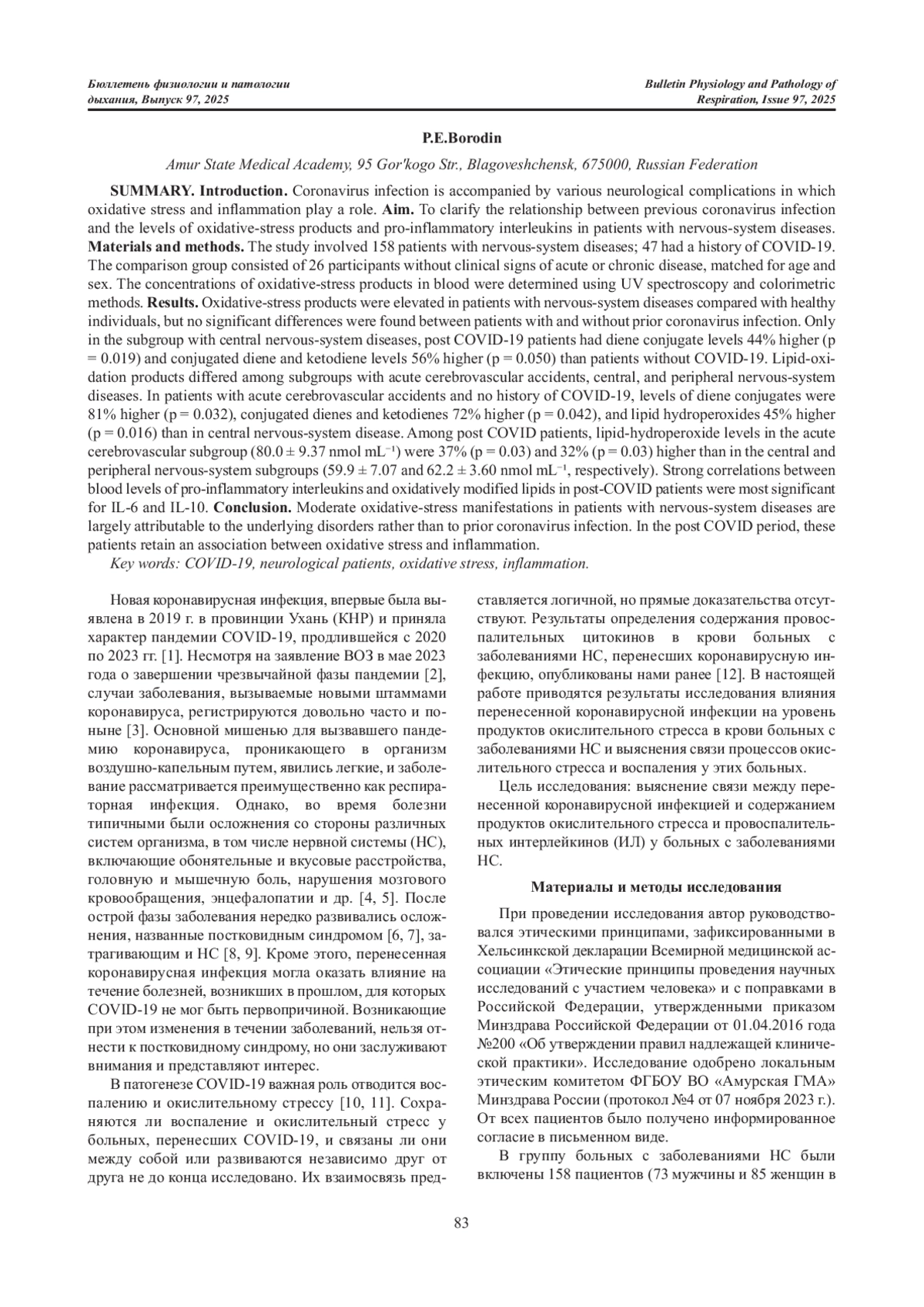 12. Бородин П.Е., Бородин Е.А., Перельман Ю.М. Содержание в крови провоспалительных интерлейкинов при COVID-19 в различных группах неврологических больных // Материалы XVIII международной научной конференции “Системный анализ в медицине” (САМ 2024) / под общ. ред. В.П. Колосова. Благовещенск: ДНЦ ФПД, 2024. С.32-35. DOI: 10.36604/conference-SAM-2024