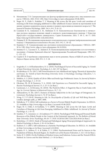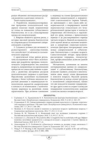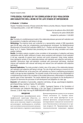 Результаты. Корреляционный анализ выявил тесную сопряжённость всех параметров субъективного благополучия (удовлетворённости жизнью, здоровьем, реализованности потребностей, стрессоустойчивости) с показателями самореализации в пожилом возрасте, особенно её общим уровнем, гармоничностью и социальным компонентом. С помощью кластерного анализа выделены три типологических варианта соотношения самореализации и субъективного благополучия: гармоничный (высокая самореализация в сочетании с выраженным благополучием), диссонансный (интенсивная самореализация при сниженном благополучии) и редуцированный (низкая самореализация и субъективное неблагополучие).