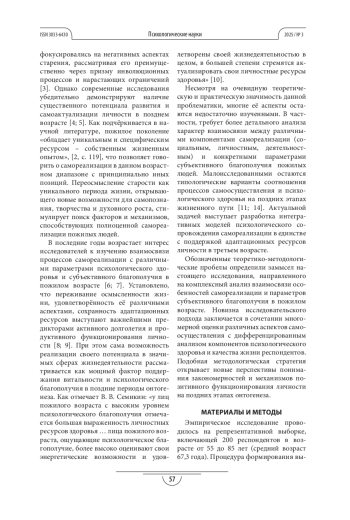 Процедура и методы. Эмпирическое исследование проводилось на репрезентативной выборке из 200 респондентов в возрасте 55–85 лет с применением двух взаимодополняющих психодиагностических методик: Многомерного опросника самореализации личности (МОСЛ) С. И. Кудинова и опросника «Ваше самочувствие» О. С. Копиной. Статистическая обработка данных осуществлялась методами корреляционного и кластерного анализа.