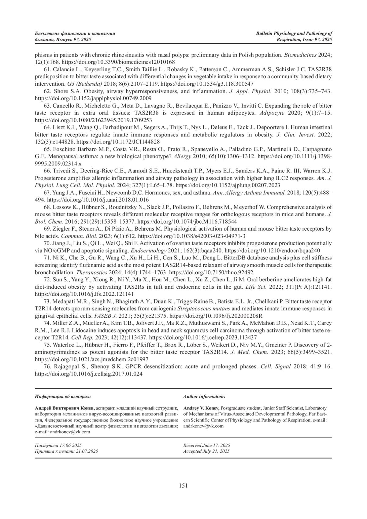 26. Nayak A.P., Shah S.D., Michael J.V., Deshpande D.A. Bitter taste receptors for asthma therapeutics // Front. Physiol. 2019. Vol.10. Article number:884. DOI: 10.3389/fphys.2019.00884