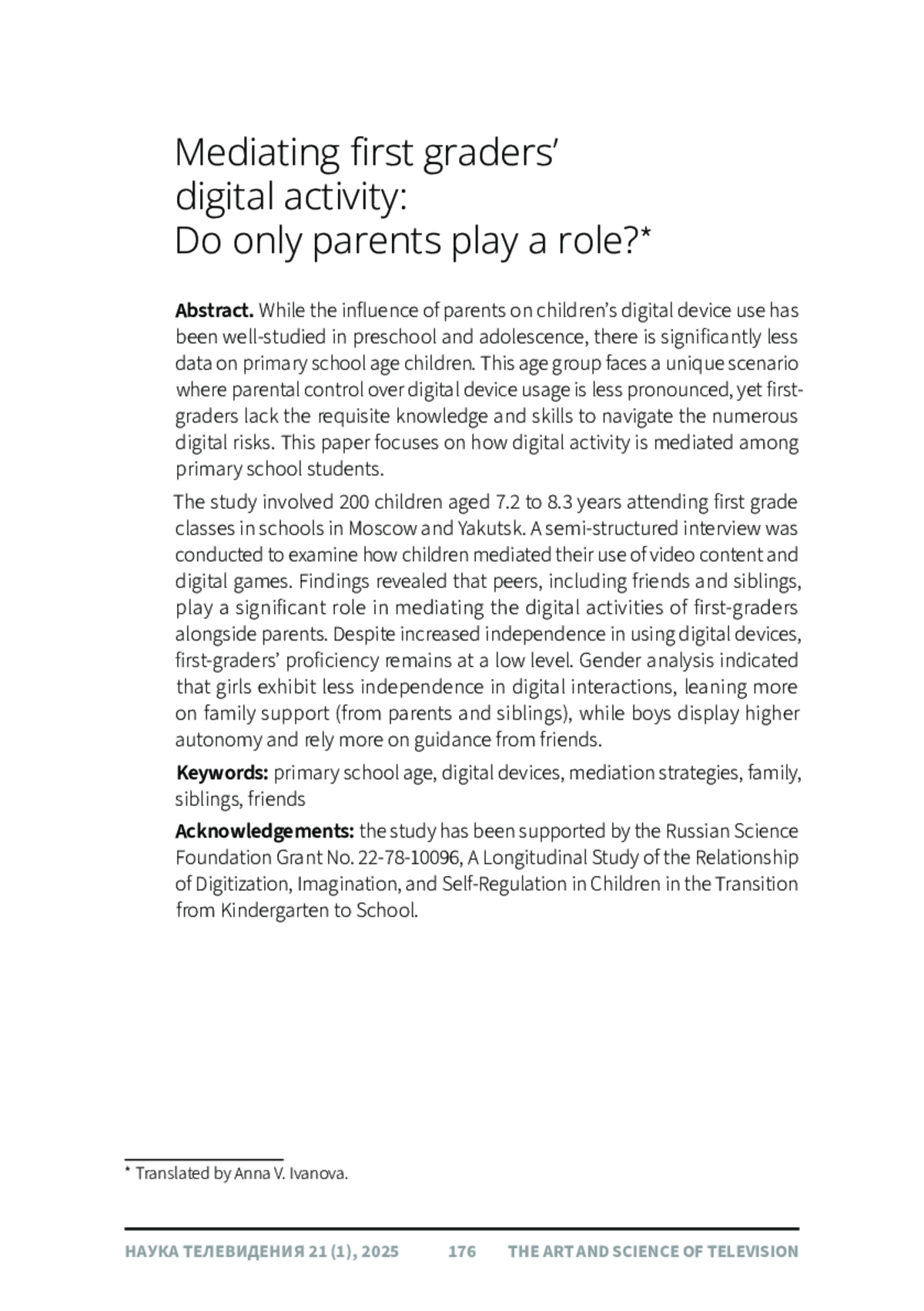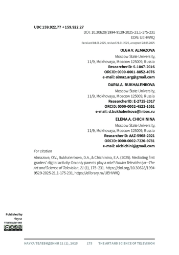 Роль родителей в использования детьми цифровых устройств достаточно хорошо изучена в дошкольном и подростковом возрастах, тогда как данных о младших школьниках существенно меньше. При этом младший школьный возраст характеризуется особой ситуацией, когда использование детьми цифровых устройств уже не так сильно контролируется родителями, но первоклассники еще не обладают достаточными знаниями и умениями для того, чтобы справляться с многочисленными цифровыми рисками. Это обусловливает цель данной статьи, которая посвящена изучению особенностей медиации цифровой активности младших школьников. В исследовании приняли участие 200 детей в возрасте от 7.2 до 8.3 лет, посещавшие первые классы общеобразовательных школ г. Москвы и г. Якутска. Для изучения особенностей использования цифровых устройств первоклассниками с детьми было проведено полуструктурированное интервью, содержавшее вопросы о медиации просмотра видеоконтента и цифровых игр первоклассниками. В результате проведенного исследования удалось выявить большую роль не только родителей, но и сверстников (друзей и сиблингов) в медиации цифровой активности первоклассников. При возросшей самостоятельности первоклассников при использовании цифровых устройств их компетентность остается на невысоком уровне. Анализ половых различий показал, что девочки при использовании цифровых устройств проявляют меньше самостоятельности и больше ориентируются на помощь и сопровождение со стороны семьи (родителей и сиблингов), а мальчики проявляют большую самостоятельность и больше ориентируются на друзей.