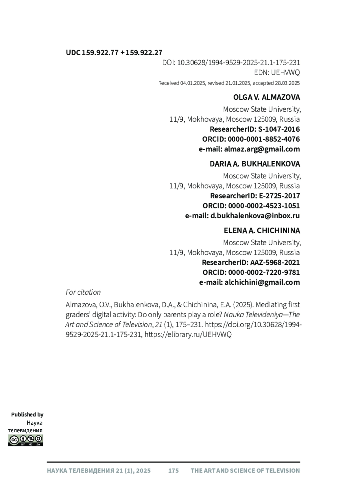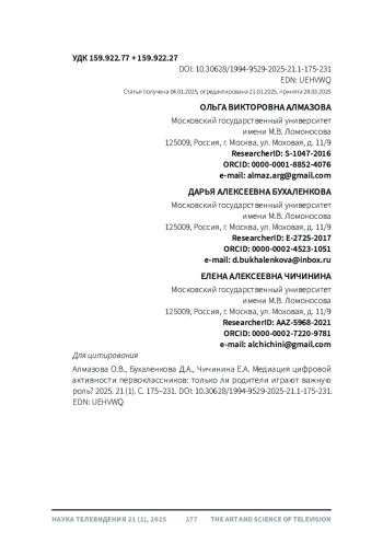 11. Руднова, Н.А., Корниенко, Д.С., Волкова, Е.Н., Исаева, О.М. (2023). Цифровая родительская медиация и ее связь с показателями психологического благополучия детей школьного возраста. Наука телевидения, 19 (1), 175-198. ,. DOI: 10.30628/1994-9529-2023-19.1-175-198 EDN: RBDUZW