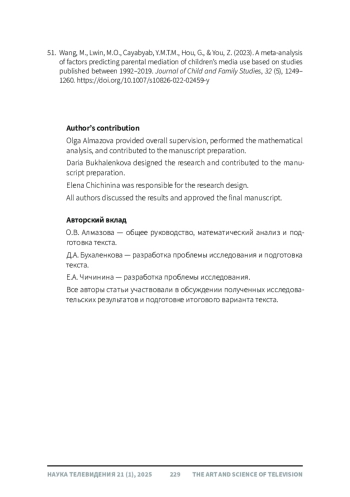 51. Wang, M., Lwin, M.O., Cayabyab, Y.M.T.M., Hou, G., & You, Z. (2023). A meta-analysis of factors predicting parental mediation of children’s media use based on studies published between 1992-2019. Journal of Child and Family Studies, 32 (5), 1249-1260. DOI: 10.1007/s10826-022-02459-y EDN: LOAPBR