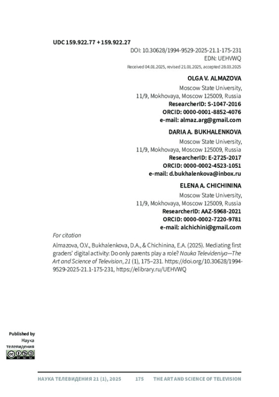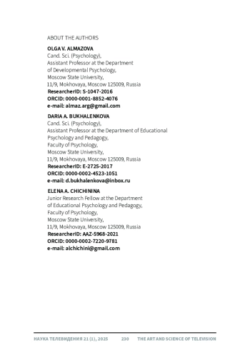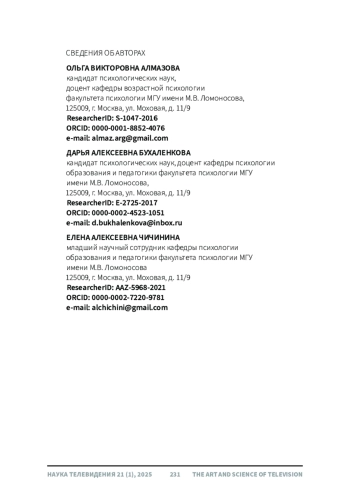 25. Bukhalenkova, D.A., Chichinina, E.A., & Almazova, O.V. (2023). How does joint media engagement affect the development of executive functions in 5- to -7 year- old children? Psychology in Russia: State of the Art, 16 (4), 109-127. DOI: 10.11621/pir.2023.0407 EDN: FKEQYE