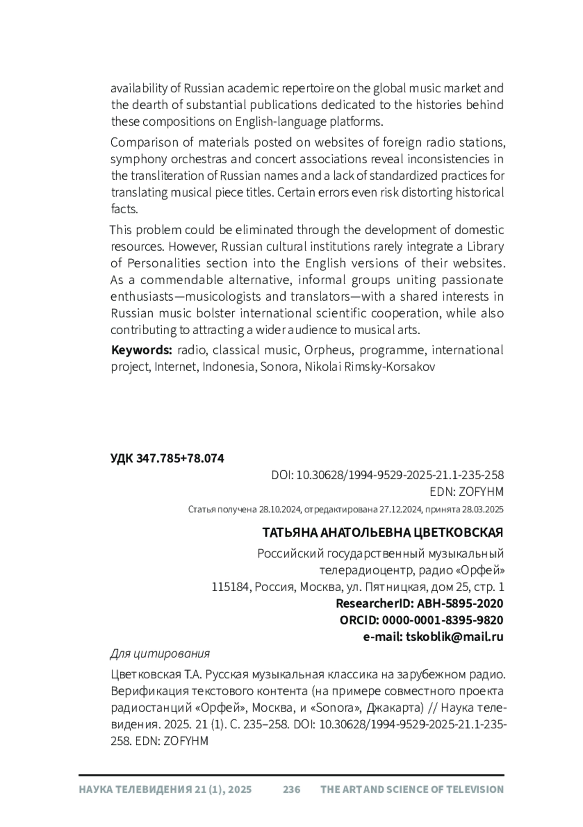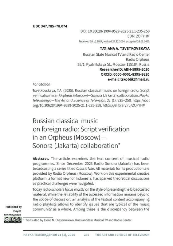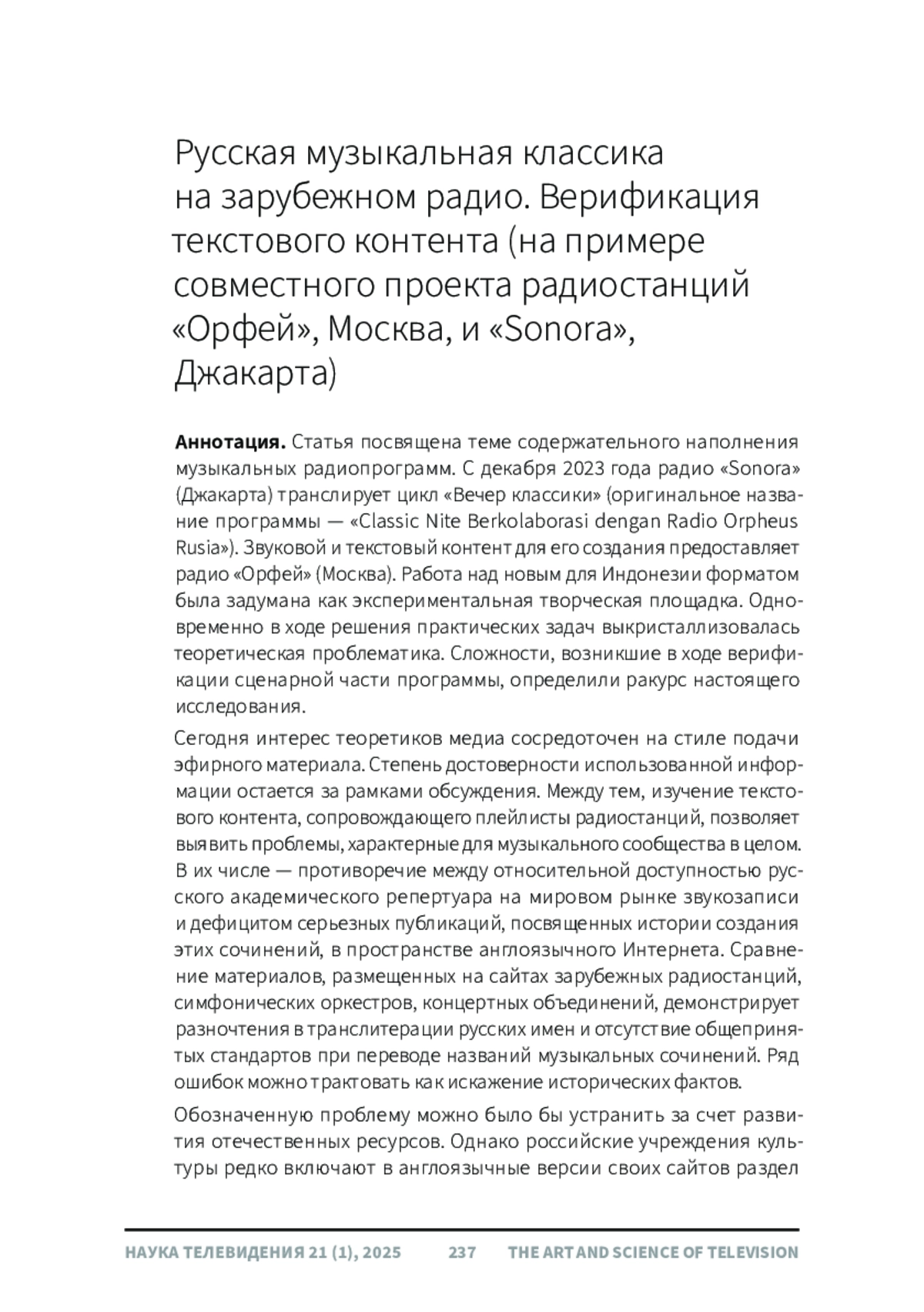 Статья посвящена теме содержательного наполнения музыкальных радиопрограмм. С декабря 2023 года радио «Sonora» (Джакарта) транслирует цикл «Вечер классики» (оригинальное название программы - «Classic Nite Berkolaborasi dengan Radio Orpheus Rusia»). Звуковой и текстовый контент для его создания предоставляет радио «Орфей» (Москва). Работа над новым для Индонезии форматом была задумана как экспериментальная творческая площадка. Одновременно в ходе решения практических задач выкристаллизовалась теоретическая проблематика. Сложности, возникшие в ходе верификации сценарной части программы, определили ракурс настоящего исследования. Сегодня интерес теоретиков медиа сосредоточен на стиле подачи эфирного материала. Степень достоверности использованной информации остается за рамками обсуждения. Между тем, изучение текстового контента, сопровождающего плейлисты радиостанций, позволяет выявить проблемы, характерные для музыкального сообщества в целом. В их числе - противоречие между относительной доступностью русского академического репертуара на мировом рынке звукозаписи и дефицитом серьезных публикаций, посвященных истории создания этих сочинений, в пространстве англоязычного Интернета. Сравнение материалов, размещенных на сайтах зарубежных радиостанций, симфонических оркестров, концертных объединений, демонстрирует разночтения в транслитерации русских имен и отсутствие общепринятых стандартов при переводе названий музыкальных сочинений. Ряд ошибок можно трактовать как искажение исторических фактов. Обозначенную проблему можно было бы устранить за счет развития отечественных ресурсов. Однако российские учреждения культуры редко включают в англоязычные версии своих сайтов раздел «Библиотека персон». Перспективной здесь альтернативой являются неформальные организации, объединяющие энтузиастов - музыковедов и переводчиков, в сферу интересов которых входит русская музыка. Их деятельность не только укрепляет международное научное сотрудничество, но помогает в решении прикладных задач по расширению аудитории музыкального искусства.