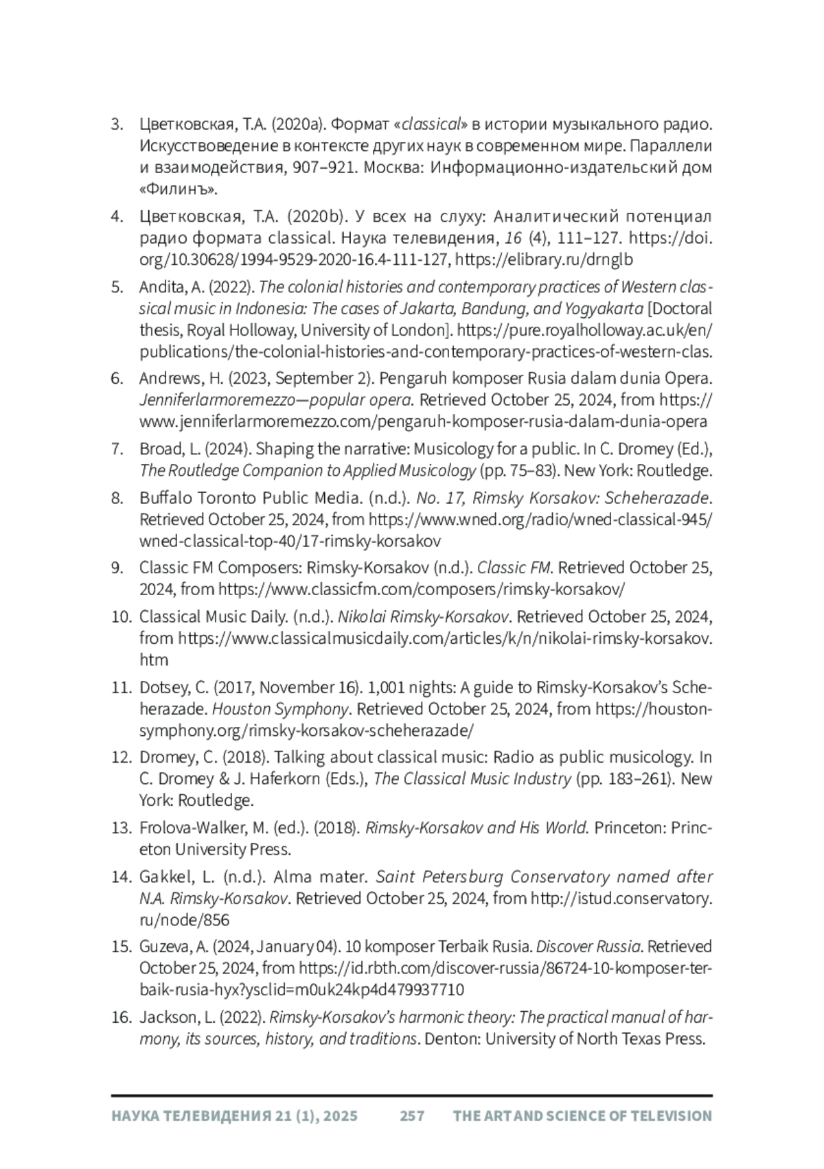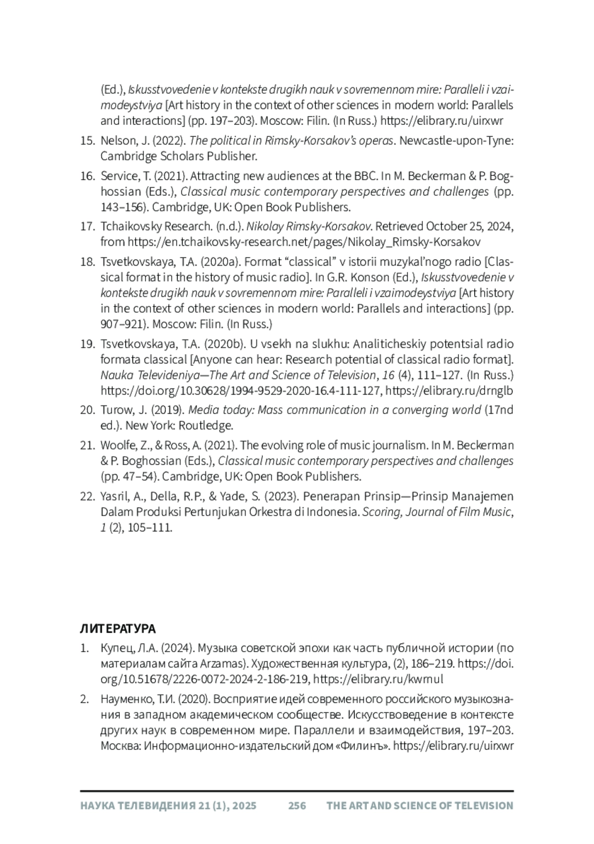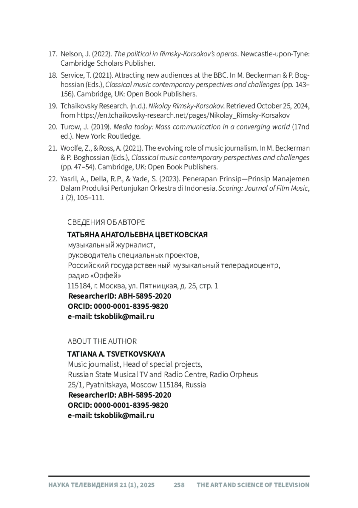 Статья посвящена теме содержательного наполнения музыкальных радиопрограмм. С декабря 2023 года радио «Sonora» (Джакарта) транслирует цикл «Вечер классики» (оригинальное название программы - «Classic Nite Berkolaborasi dengan Radio Orpheus Rusia»). Звуковой и текстовый контент для его создания предоставляет радио «Орфей» (Москва). Работа над новым для Индонезии форматом была задумана как экспериментальная творческая площадка. Одновременно в ходе решения практических задач выкристаллизовалась теоретическая проблематика. Сложности, возникшие в ходе верификации сценарной части программы, определили ракурс настоящего исследования. Сегодня интерес теоретиков медиа сосредоточен на стиле подачи эфирного материала. Степень достоверности использованной информации остается за рамками обсуждения. Между тем, изучение текстового контента, сопровождающего плейлисты радиостанций, позволяет выявить проблемы, характерные для музыкального сообщества в целом. В их числе - противоречие между относительной доступностью русского академического репертуара на мировом рынке звукозаписи и дефицитом серьезных публикаций, посвященных истории создания этих сочинений, в пространстве англоязычного Интернета. Сравнение материалов, размещенных на сайтах зарубежных радиостанций, симфонических оркестров, концертных объединений, демонстрирует разночтения в транслитерации русских имен и отсутствие общепринятых стандартов при переводе названий музыкальных сочинений. Ряд ошибок можно трактовать как искажение исторических фактов. Обозначенную проблему можно было бы устранить за счет развития отечественных ресурсов. Однако российские учреждения культуры редко включают в англоязычные версии своих сайтов раздел «Библиотека персон». Перспективной здесь альтернативой являются неформальные организации, объединяющие энтузиастов - музыковедов и переводчиков, в сферу интересов которых входит русская музыка. Их деятельность не только укрепляет международное научное сотрудничество, но помогает в решении прикладных задач по расширению аудитории музыкального искусства.