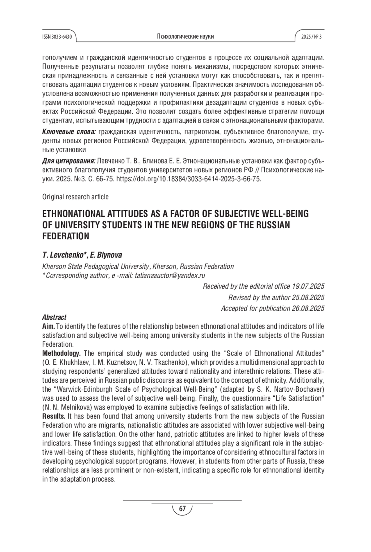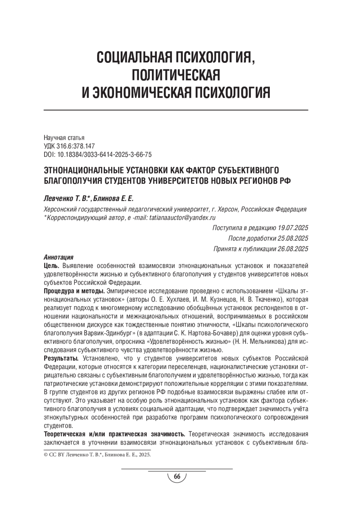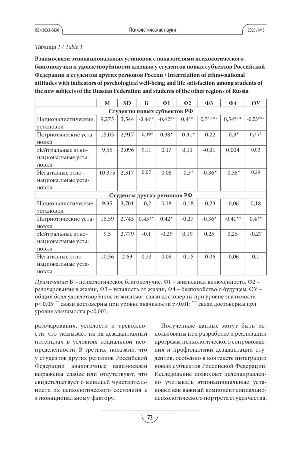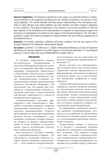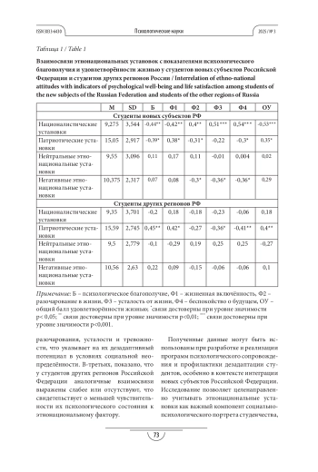 Результаты. Установлено, что у студентов университетов новых субъектов Российской Федерации, которые относятся к категории переселенцев, националистические установки отрицательно связаны с субъективным благополучием и удовлетворённостью жизнью, тогда как патриотические установки демонстрируют положительные корреляции с этими показателями. В группе студентов из других регионов РФ подобные взаимосвязи выражены слабее или отсутствуют. Это указывает на особую роль этнонациональных установок как фактора субъективного благополучия в условиях социальной адаптации, что подтверждает значимость учёта этнокультурных особенностей при разработке программ психологического сопровождения студентов. Теоретическая и/или практическая значимость.