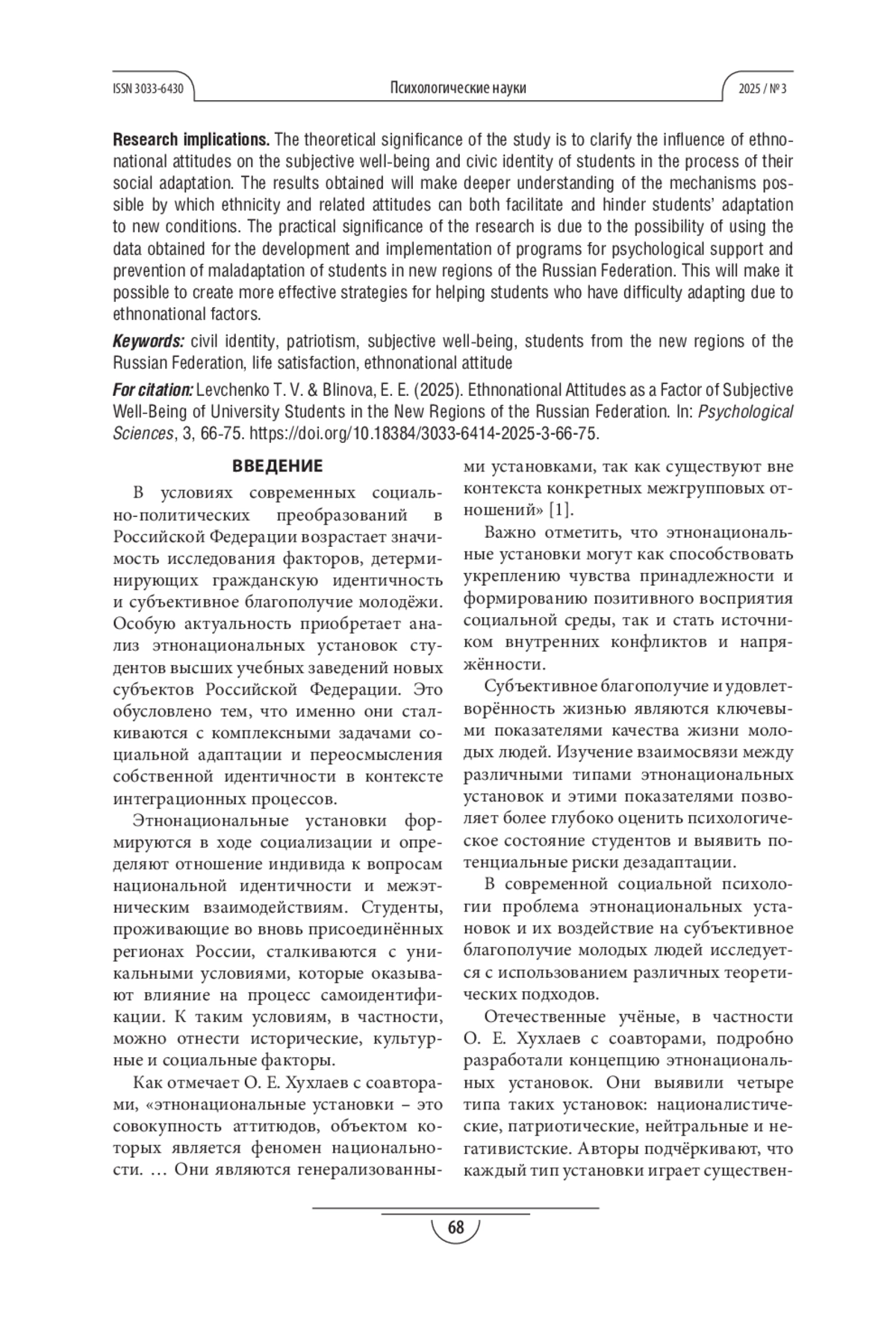 Теоретическая значимость исследования заключается в уточнении взаимосвязи этнонациональных установок с субъективным благополучием и гражданской идентичностью студентов в процессе их социальной адаптации. Полученные результаты позволят глубже понять механизмы, посредством которых этническая принадлежность и связанные с ней установки могут как способствовать, так и препятствовать адаптации студентов к новым условиям. Практическая значимость исследования обусловлена возможностью применения полученных данных для разработки и реализации программ психологической поддержки и профилактики дезадаптации студентов в новых субъектах Российской Федерации. Это позволит создать более эффективные стратегии помощи студентам, испытывающим трудности с адаптацией в связи с этнонациональными факторами.