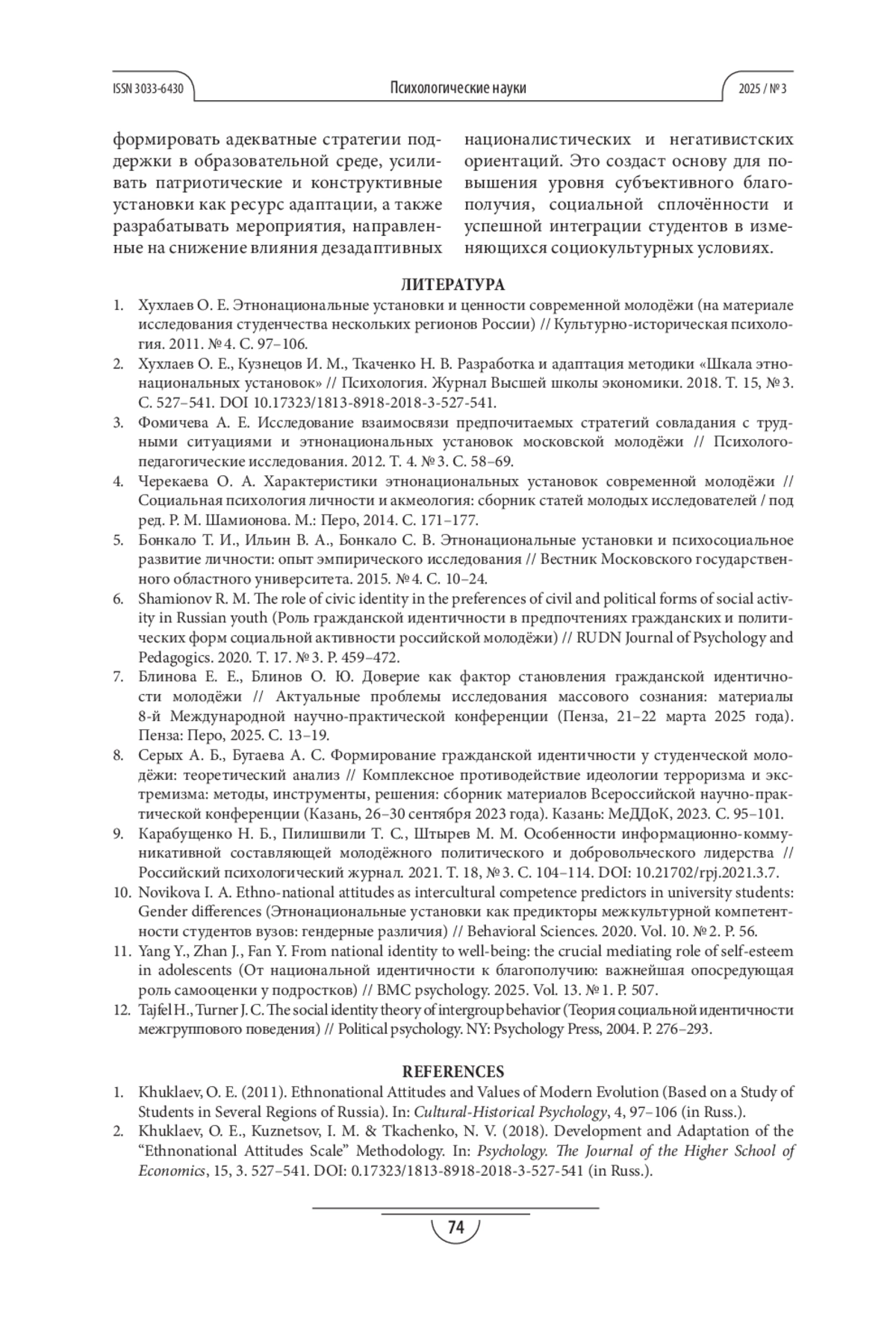 11. Yang Y., Zhan J., Fan Y. From national identity to well-being: the crucial mediating role of self-esteem in adolescents (От национальной идентичности к благополучию: важнейшая опосредующая роль самооценки у подростков) // BMC psychology. 2025. Vol. 13. № 1. P. 507.