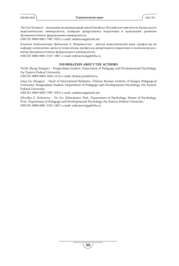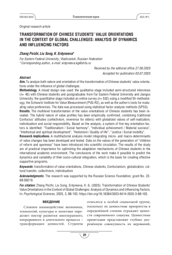 Процедура и методы. Использован смешанный дизайн: качественный этап включил полуструктурированные интервью (n= 45) с китайскими студентами и аспирантами ДВФУ и ЦЗЯНСУ; количественный этап предусматривал онлайн-опрос (n= 532) с применением модифицированной методики Ш. Шварца для измерения ценностей (PVQ-R2), а также авторского инструментария для оценки ценностных предпочтений. Обработка данных проводилась методами статистического (SPSS) факторного анализа.