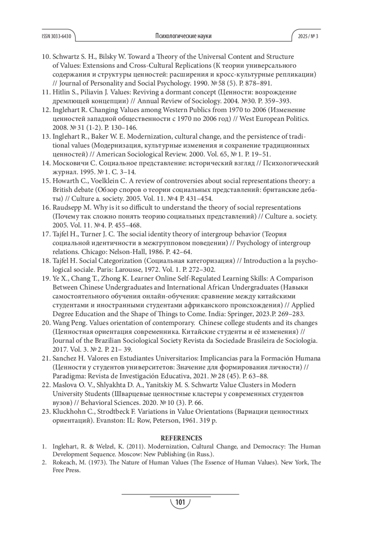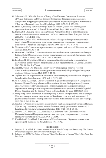22. Maslova O. V., Shlyakhta D. A., Yanitskiy M. S. Schwartz Value Clusters in Modern University Students (Шварцевые ценностные кластеры у современных студентов вузов) // Behavioral Sciences. 2020. № 10 (3). Р. 66.