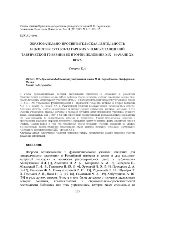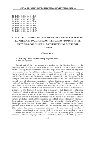 В статье проанализирована история деятельности библиотек в созданных в результате образовательной второй половины XIX в. реформы русско-татарских учебных заведениях нового типа: русско-татарских министерских училищах (РТМУ) и Симферопольской татарской учительской школе (СТУШ). Эти учреждения функционировали в Таврической губернии, начиная со второй половины XIX в. и вплоть до начала XX в. Рассмотрены вопросы комплектования библиотечных фондов, выявлены образцы учебно-методической и педагогической литературы, которые поступали в эти учебные учреждения. Важное значение в процессе обучения детей придавалось учебникам русского языка, составленным для РТМУ и СТУШ известными просветителями, использовавших современные им педагогические и дидактические приемы и разработки. Учебно-методические пособия и произведения классиков мировой литературы составляли основу книжного фонда библиотек школ и училищ. Сделан вывод о том, что библиотеки русско-татарских учебных заведений во многом способствовали распространению просвещения среди крымско-татарской молодежи Таврической губернии во второй половине XIX - начале XX в.