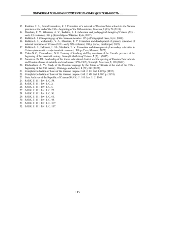 17. Редькина Л. И., Бекирова, Э. Ш., Шушара, Т. В. Становление и развитие среднего образования Крыма (ХIХ - начало ХХ века) / Л. И. Редькина, Э. Ш. Бекирова, Т. В. Шушара; Отв. редактор: Редькина Л. И.; Крым. федер. ун-т им. В.И. Вернадского. - М.: Перо, 2023. - 390 с. EDN: QZCLEL