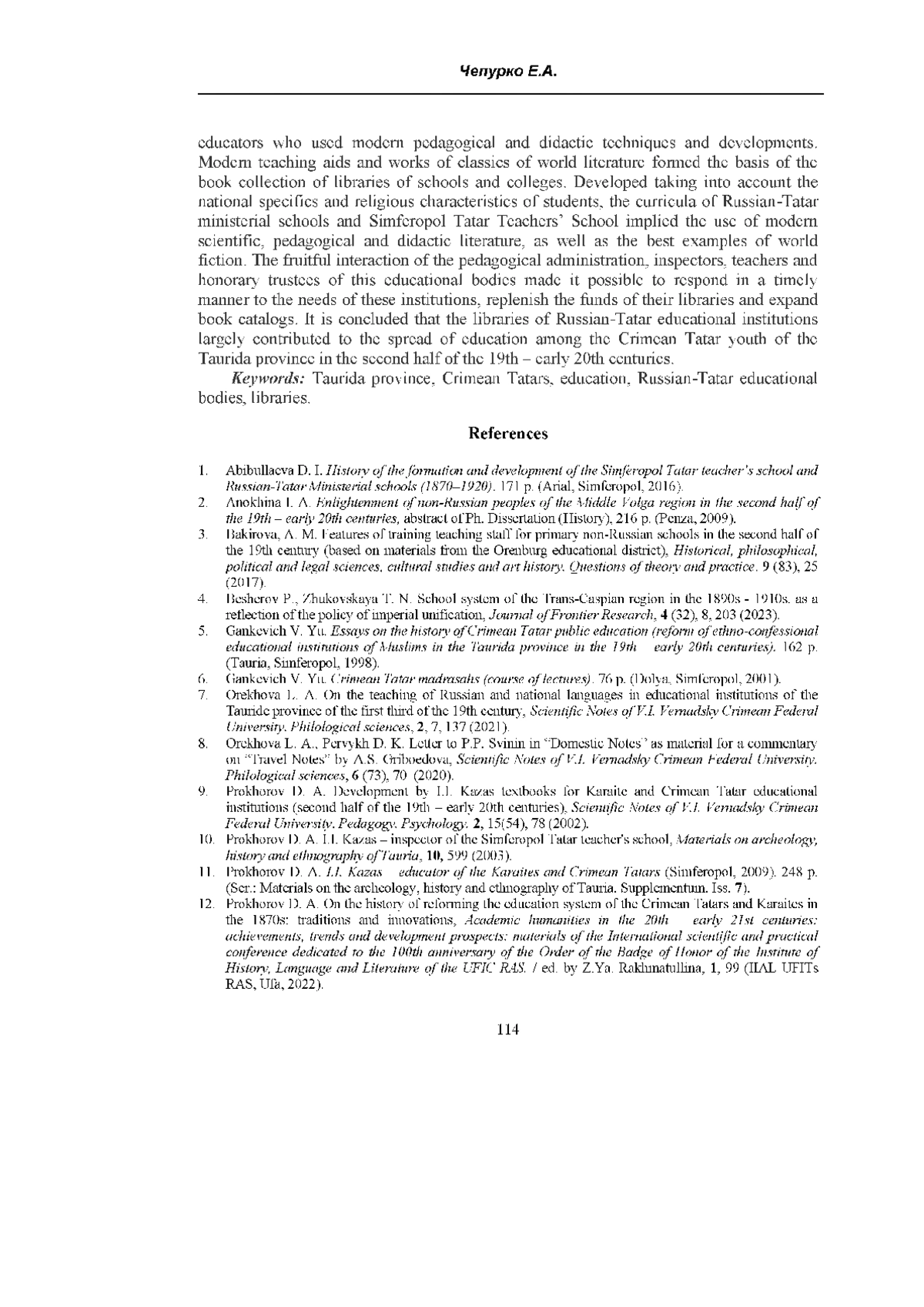 12. Прохоров Д. А. К истории реформирования системы образования крымских татар и караимов в 1870-х гг.: традиции и новации / Д.А. Прохоров // Академическая гуманитарная наука в XX - начале XXI в.: достижения, тренды и перспективы развития: материалы Международной научно-практической конференции, посвященной 100-летию Ордена Знак Почета Института истории, языка и литературы УФИЦ РАН. В 2 ч. Ч. I / отв. ред. З.Я. Рахматуллина. - Уфа: ИИЯЛ УФИЦ РАН, 2022. - С. 99-103.