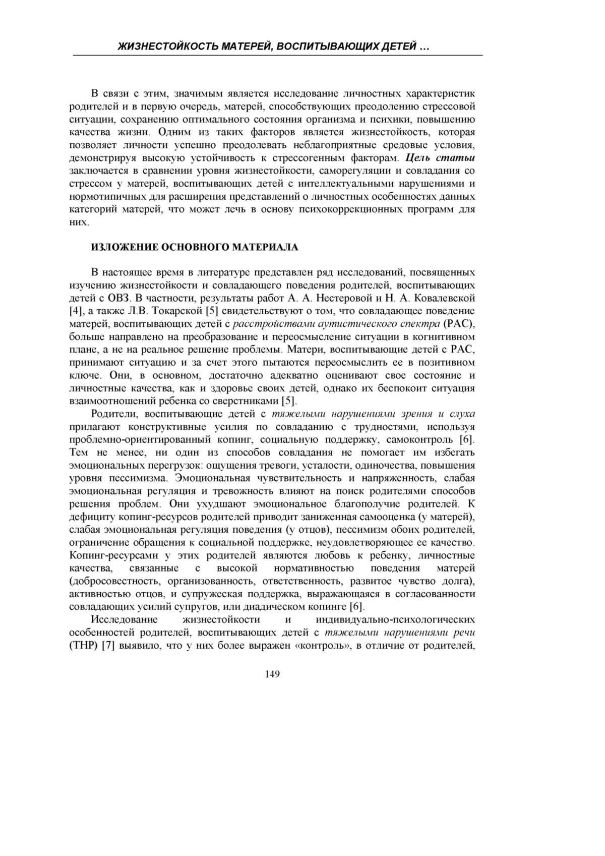4. Нестерова А.А. Жизнеспособность и стратегии совладания матерей, воспитывающих детей с расстройствами аутистического спектра / А.А. Нестерова, Н.А. Ковалевская // Вестн. МГОУ. Сер.: Психол. науки. - 2015. - № 3. - С. 38-46.