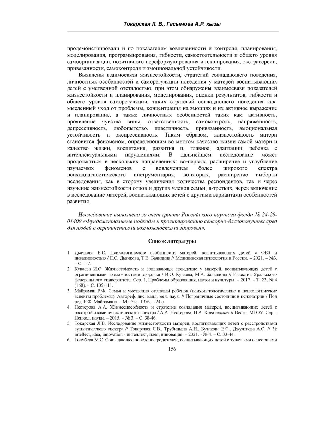 5. Токарская Л.В. Исследование жизнестойкости матерей, воспитывающих детей с расстройствами аутистического спектра // Токарская Л.В., Трубицына А.Н., Бутакова Е.С., Джултаева А.С. // 3i: intellect, idea, innovation - интеллект, идея, инновация. - 2021. - № 4. - С. 33-44. EDN: QLERIQ