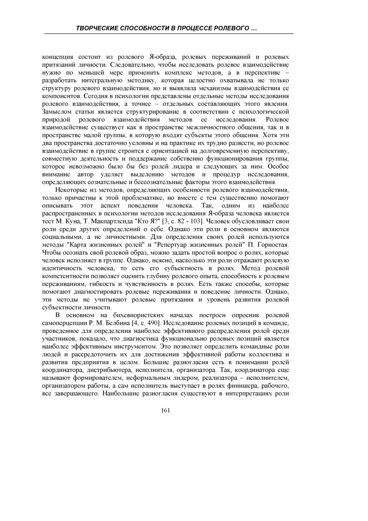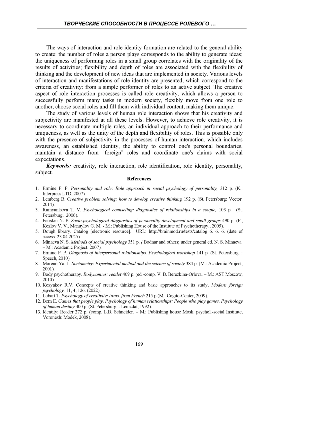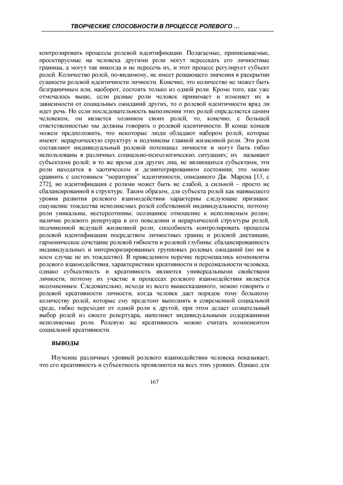 Способы взаимодействия и формирования ролевой идентичности связаны с общей способностью к творчеству: количество ролей, которые человек играет, соответствует способности генерировать идеи; уникальность исполнения ролей в небольшой группе соотносится с оригинальностью результатов деятельности; гибкость и глубина ролей связаны с гибкостью мышления и разработкой новых идей, которые реализуются в обществе. Представлены различные уровни взаимодействия и проявления ролевой идентичности, которые соответствуют критериям творчества: от простого исполнителя ролей до активного субъекта. Творческий аспект процессов ролевого взаимодействия называется ролевым творчеством, которое позволяет человеку успешно выполнять множество задач в современном обществе, гибко переходить от одной роли к другой, выбирать социальные роли и заполнять их индивидуальным содержанием, делая их уникальными.