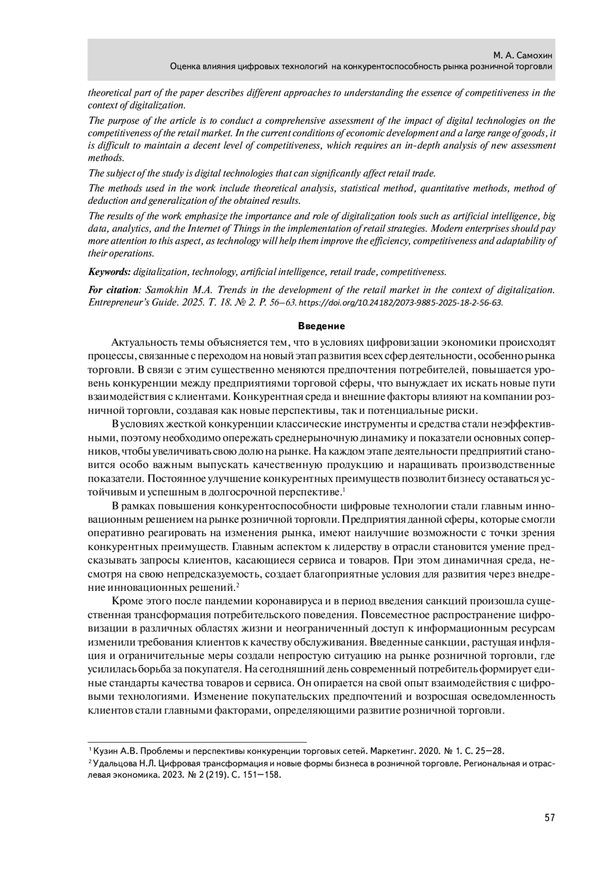 Целью статьи является проведение комплексной оценки влияния цифровых технологий на конкурентоспособность рынка розничной торговли.
