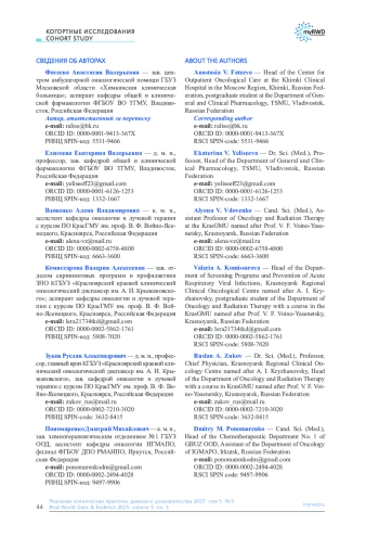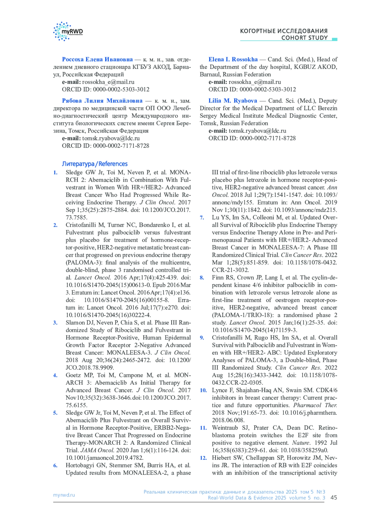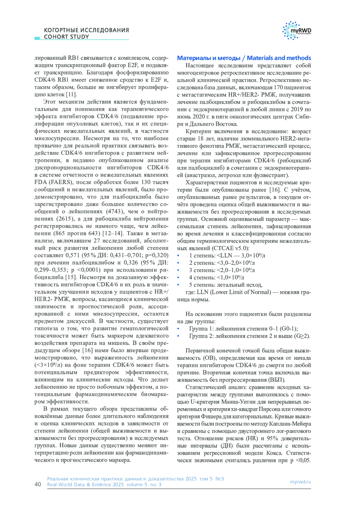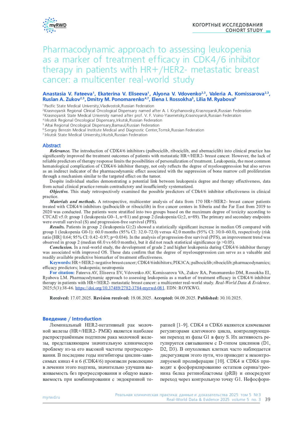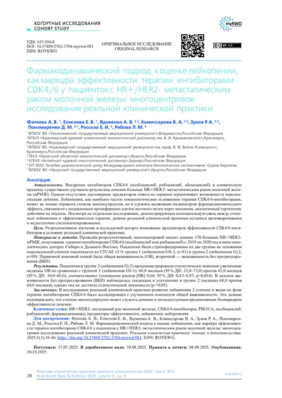ФАТЕЕВА А. В., ЕЛИСЕЕВА Е. В., ВДОВЕНКО А. В., КОМИССАРОВА В. А., ЗУКОВ Р. А., ПОНОМАРЕНКО Д. М., РОССОХА Е. И., РЯБОВА Л. М. ФАРМАКОДИНАМИЧЕСКИЙ ПОДХОД К ОЦЕНКЕ ЛЕЙКОПЕНИИ, КАК МАРКЁРА ЭФФЕКТИВНОСТИ ТЕРАПИИ ИНГИБИТОРАМИ CDK4/6 У ПАЦИЕНТОК С HR+/HER2- МЕТАСТАТИЧЕСКИМ РАКОМ МОЛОЧНОЙ ЖЕЛЕЗЫ: МНОГОЦЕНТРОВОЕ ИССЛЕДОВАНИЕ РЕАЛЬНОЙ КЛИНИЧЕСКОЙ ПРАКТИКИ // РЕАЛЬНАЯ КЛИНИЧЕСКАЯ ПРАКТИКА: ДАННЫЕ И ДОКАЗАТЕЛЬСТВА. 2025. № 3, ТОМ 5