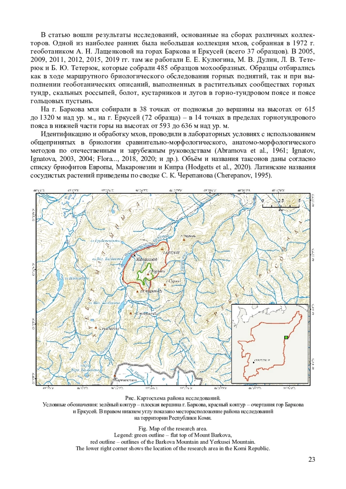 7. Дулин М. В. 2020. Печёночники горы Баркова (Приполярный Урал, Республика Коми) // Разнообразие растительного мира. № 2 (5). С. 4-13. DOI: 10.22281/2686-9713-2020-2-4-13 EDN: JPENLV
