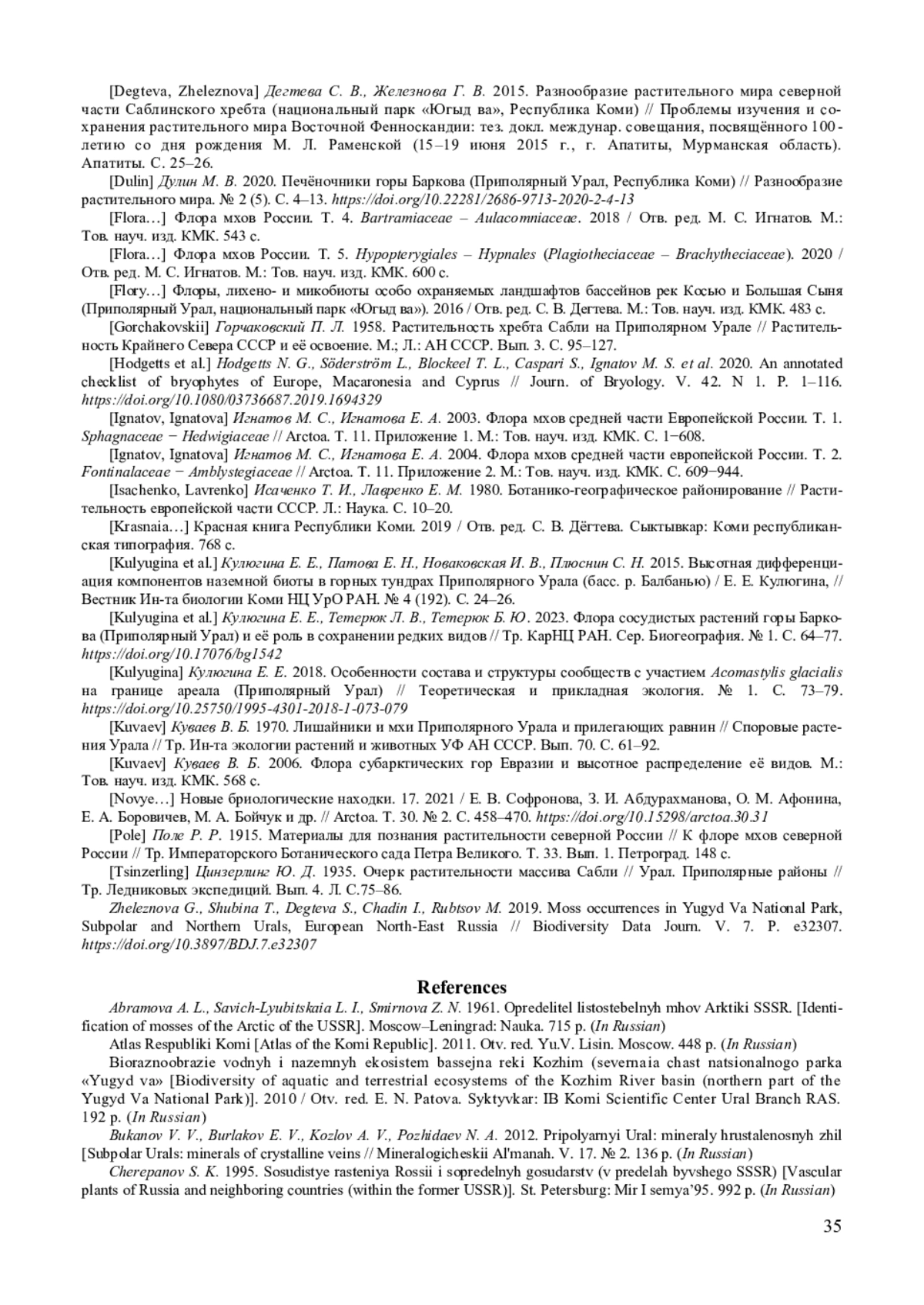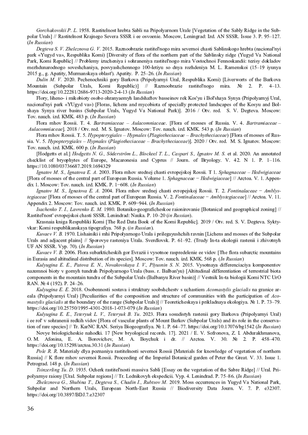 25. Zheleznova G., Shubina T., Degteva S., Chadin I., Rubtsov M. 2019. Moss occurrences in Yugyd Va National Park, Subpolar and Northern Urals, European North-East Russia // Biodiversity Data Journ. V. 7. P. e32307.