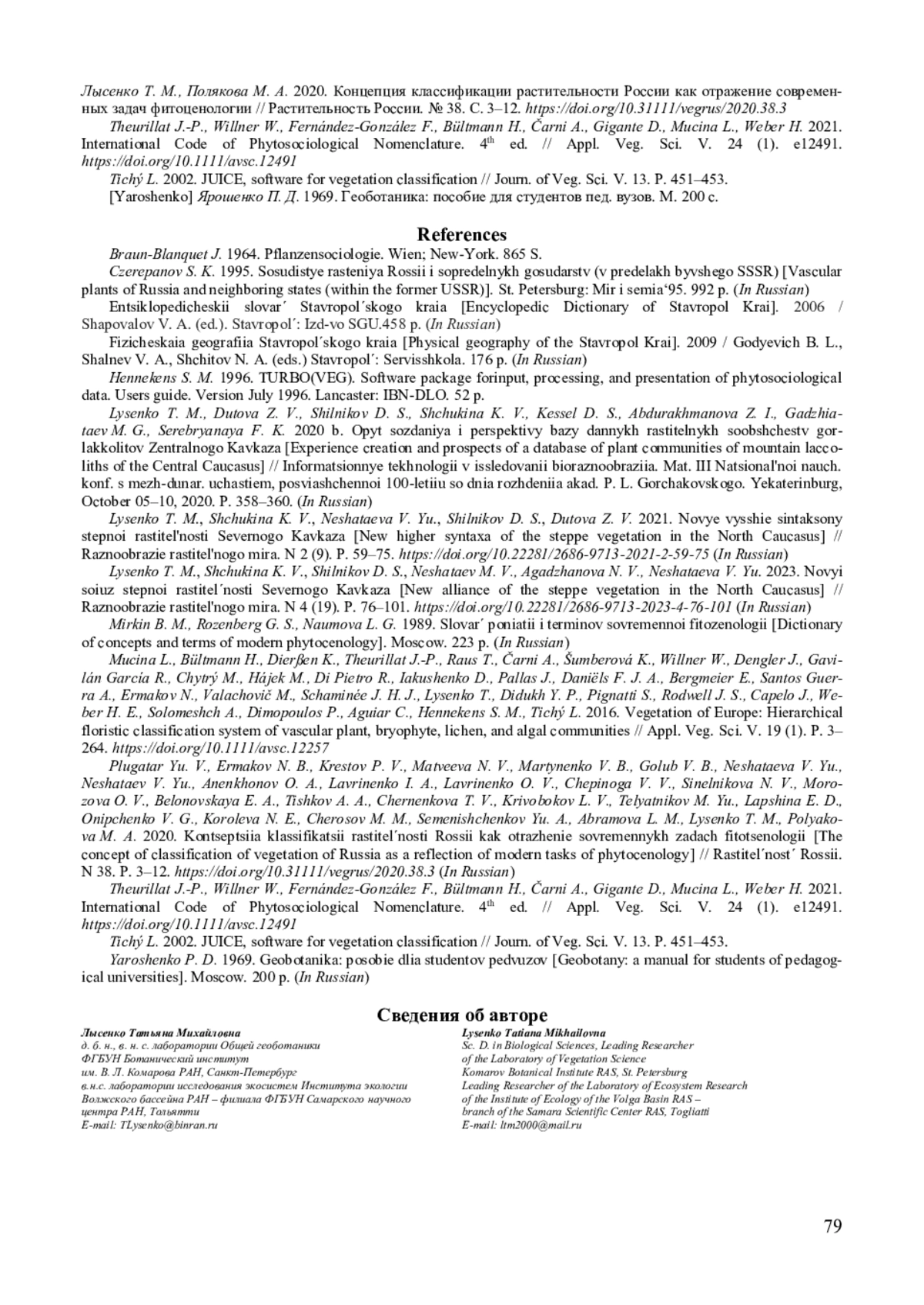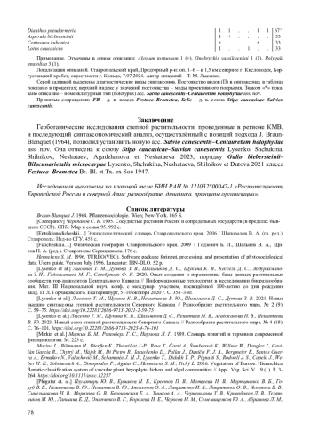 7. Лысенко Т. М., Щукина К. В., Нешатаева В. Ю., Шильников Д. С., Дутова З. В. 2021. Новые высшие синтаксоны степной растительности Северного Кавказа // Разнообразие растительного мира. № 2 (9). С. 59-75. DOI: 10.22281/2686-9713-2021-2-59-75 EDN: DYSVUL
