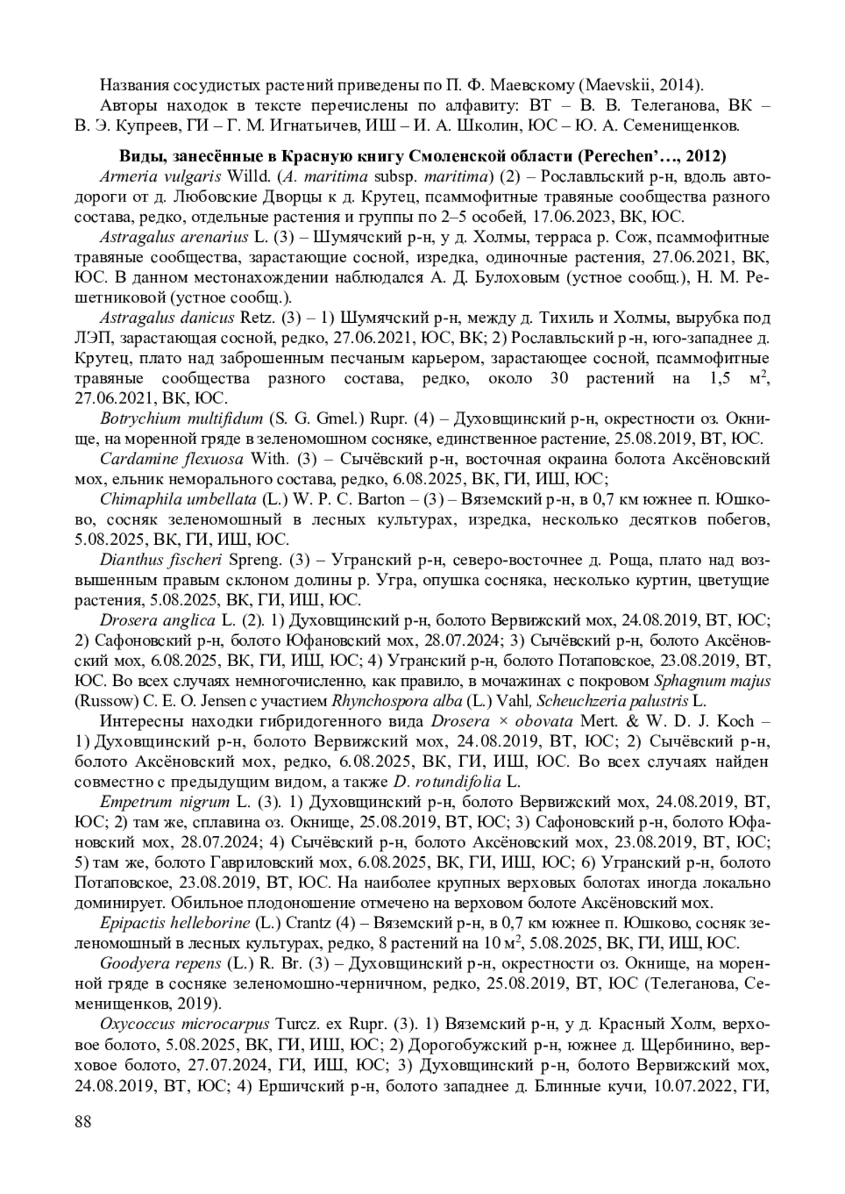 В 2019–2025 гг. авторами проводились флористико-геоботанические исследования на территории Смоленской области, в ходе которых были выявлены местонахождения некоторых редких, нуждающихся в охране и занесённых в региональную Красную книгу (Perechen’…, 2012) видов растений, а также видов с недостаточно изученным распространением и нуждающихся в мониторинге (Reshetnikova et al., 2007).