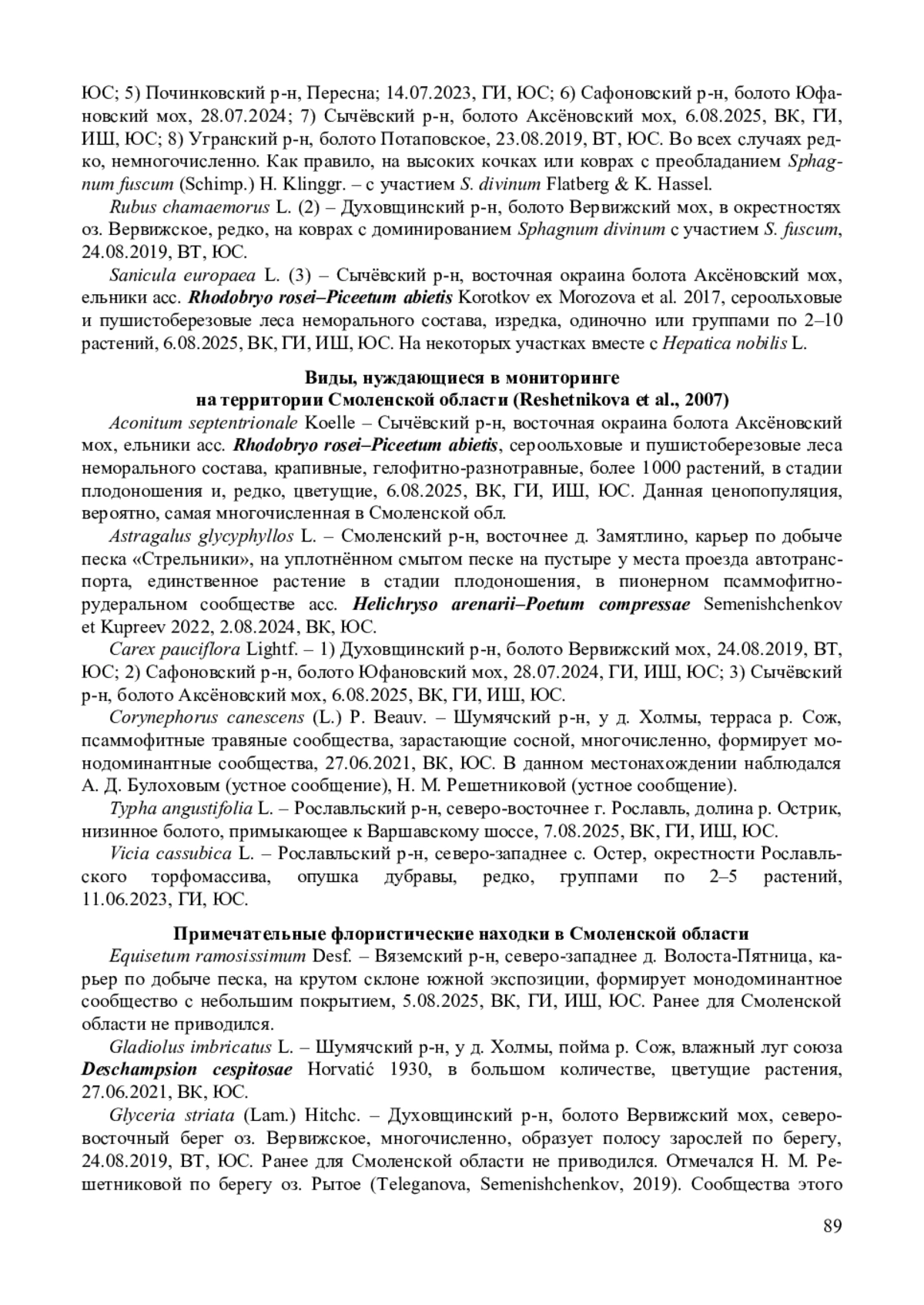 В 2019–2025 гг. авторами проводились флористико-геоботанические исследования на территории Смоленской области. Главной их целью было описание фитоценотического разнообразия псаммофитной травяной и болотной растительности. В ходе этого обследования на территории области выявлены местонахождения некоторых редких, нуждающихся в охране и занесённых в региональную Красную книгу (Perechen’…, 2012) видов растений, а также видов с недостаточно изученным распространением, нуждающихся в мониторинге (Reshetnikova et al., 2007). Ранее сведения об интересных флористических находках в Смоленской области уже публиковались нами (Semenishchenkov et al., 2017) и были учтены при разработке региональной схемы ботанико-географического районирования (Semenishchenkov, 2018). Некоторые находки отмечены в отчёте авторов по НИР в Национальном парке «Смоленское Поозерье» (Teleganova, Semenishchenkov, 2019), однако не были опубликованы.