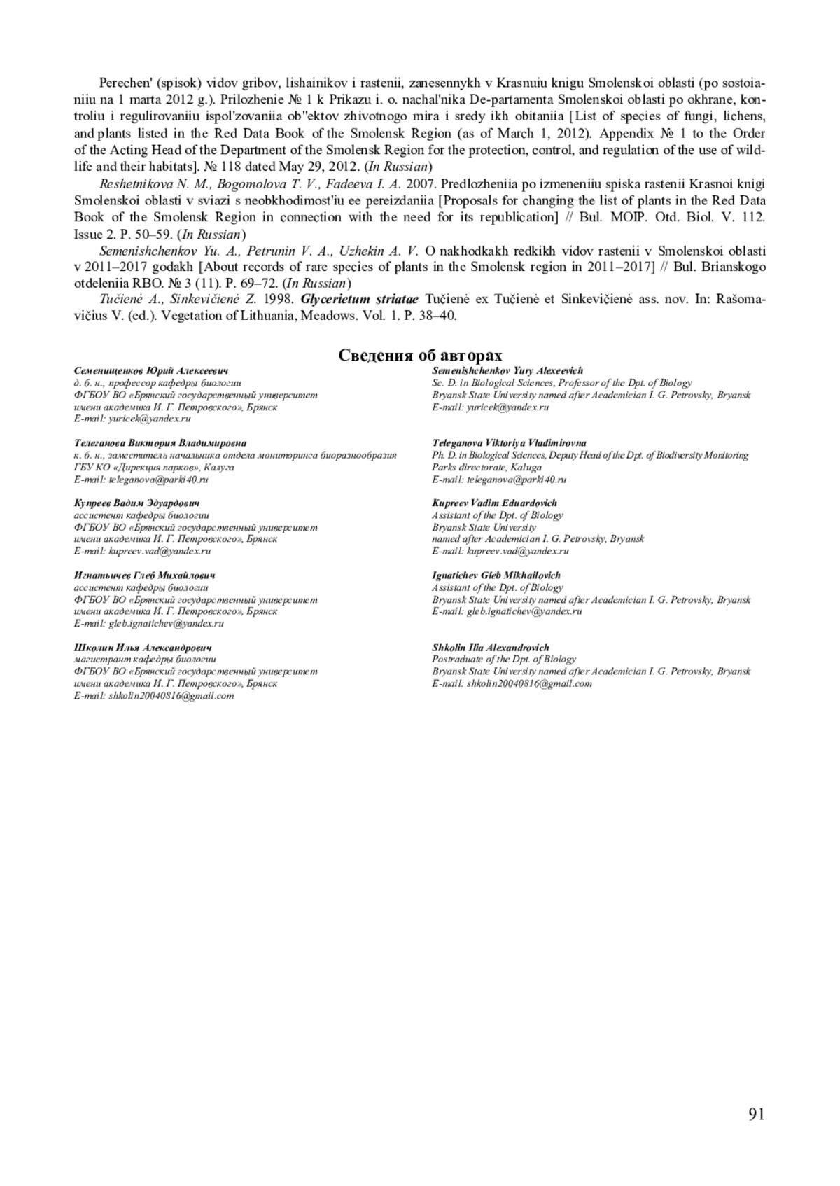 5. Решетникова Н. М., Богомолова Т. В., Фадеева И. А. 2007. Предложения по изменению списка растений Красной книги Смоленской области в связи с необходимостью её переиздания // Бюл. МОИП. Отд. Биол. Т. 112. Вып. 2. С. 50-59.
