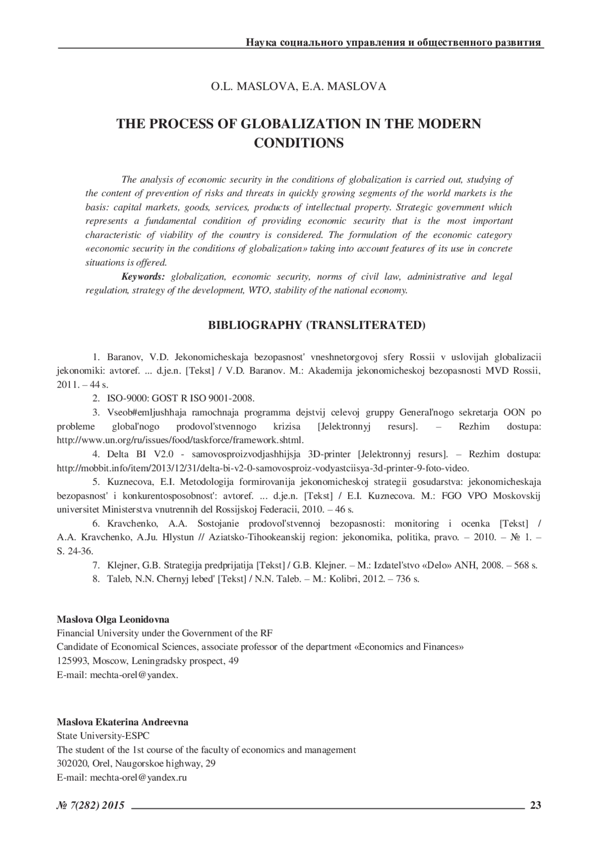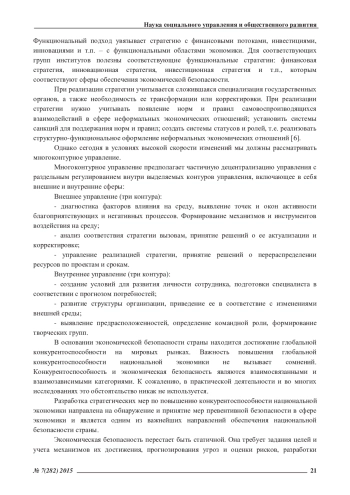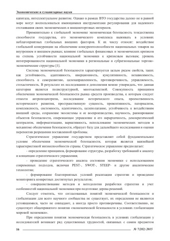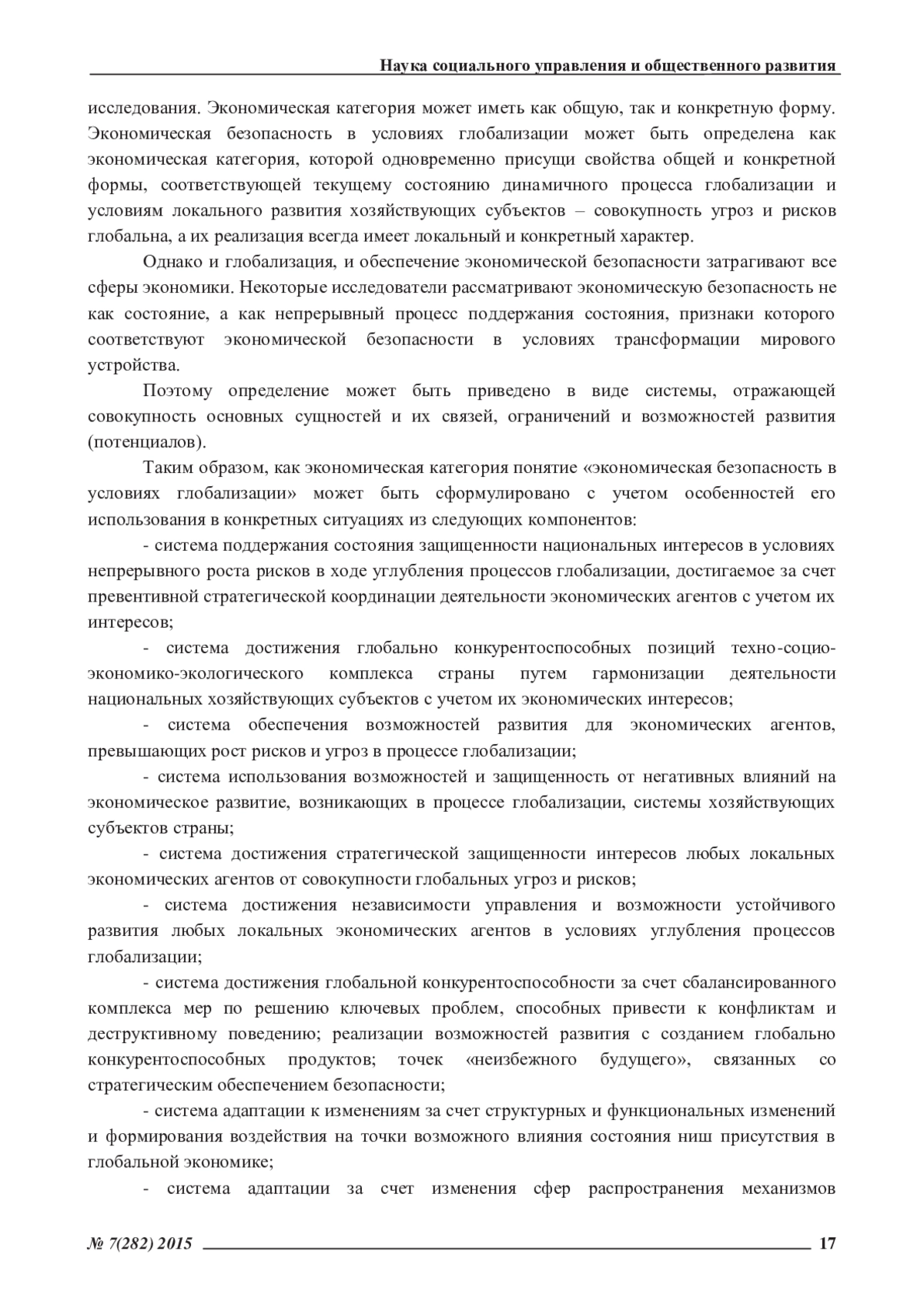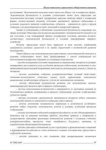 Проведен анализ экономической безопасности в условиях глобализации, в основу положено изучение содержания предотвращения рисков и угроз на быстро растущих сегментах мировых рынков: рынках капитала, товаров, услуг, продуктов интеллектуальной собственности. Рассмотрено стратегическое управление государством, которое представляет собой фундаментальное условие обеспечения экономической безопасности, что является важнейшей характеристикой жизнеспособности страны. Предложена формулировка экономической категории «экономическая безопасность в условиях глобализации» с учетом особенностей его использования в конкретных ситуациях