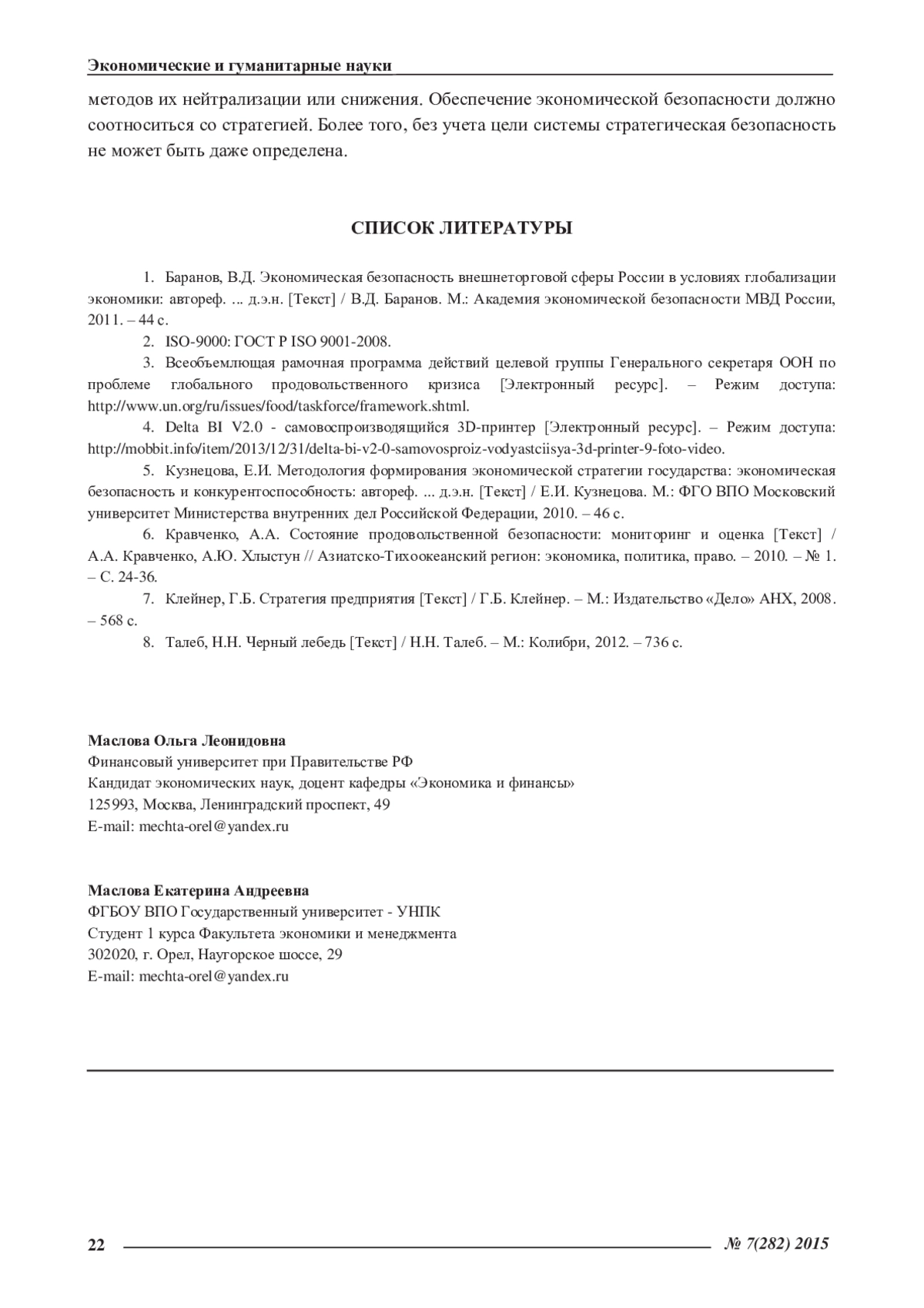 1. Баранов, В.Д. Экономическая безопасность внешнеторговой сферы России в условиях глобализации экономики: автореф.. д.э.н. /В.Д. Баранов. М.: Академия экономической безопасности МВД России, 2011. -44 с. EDN: QUVAYD