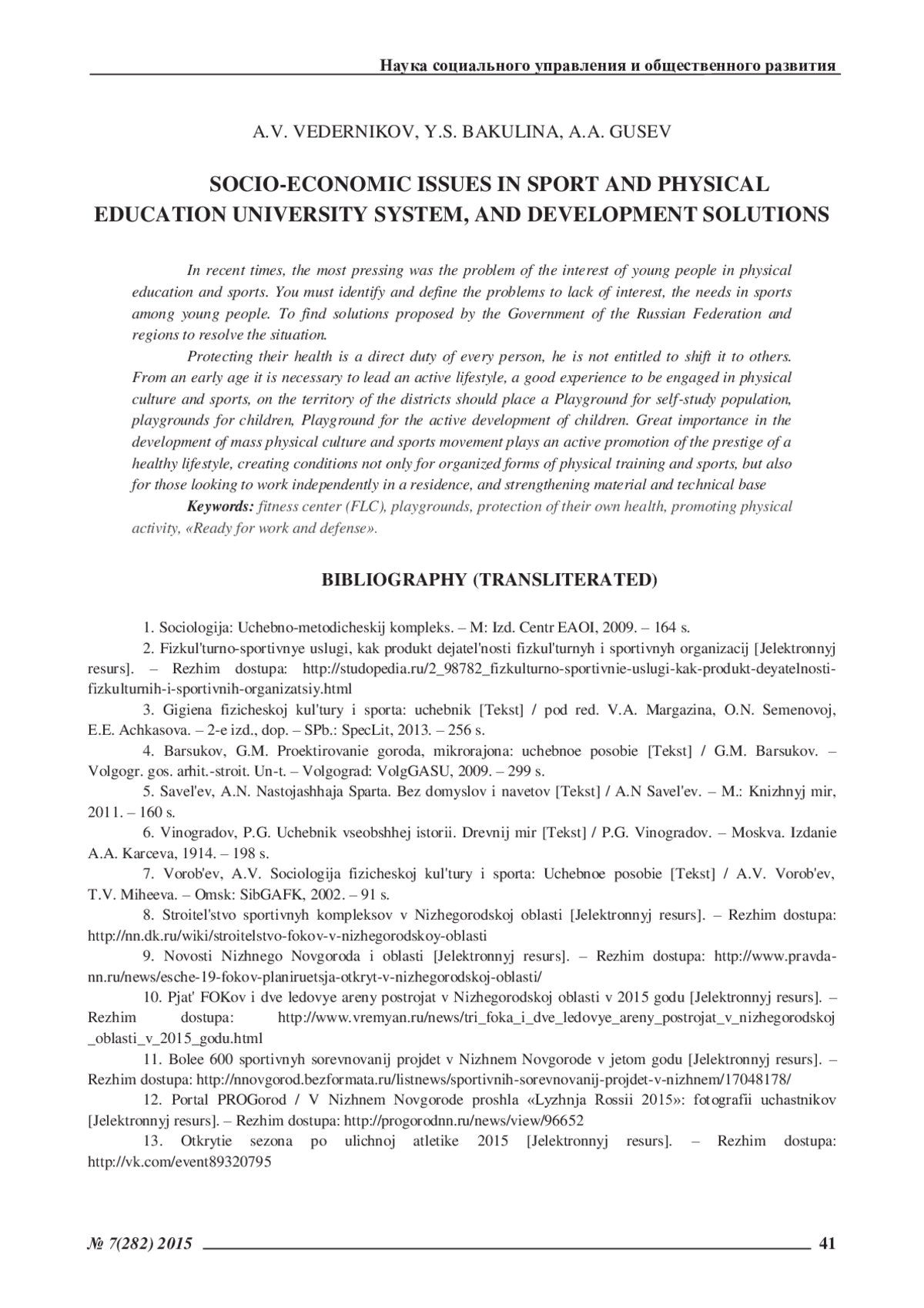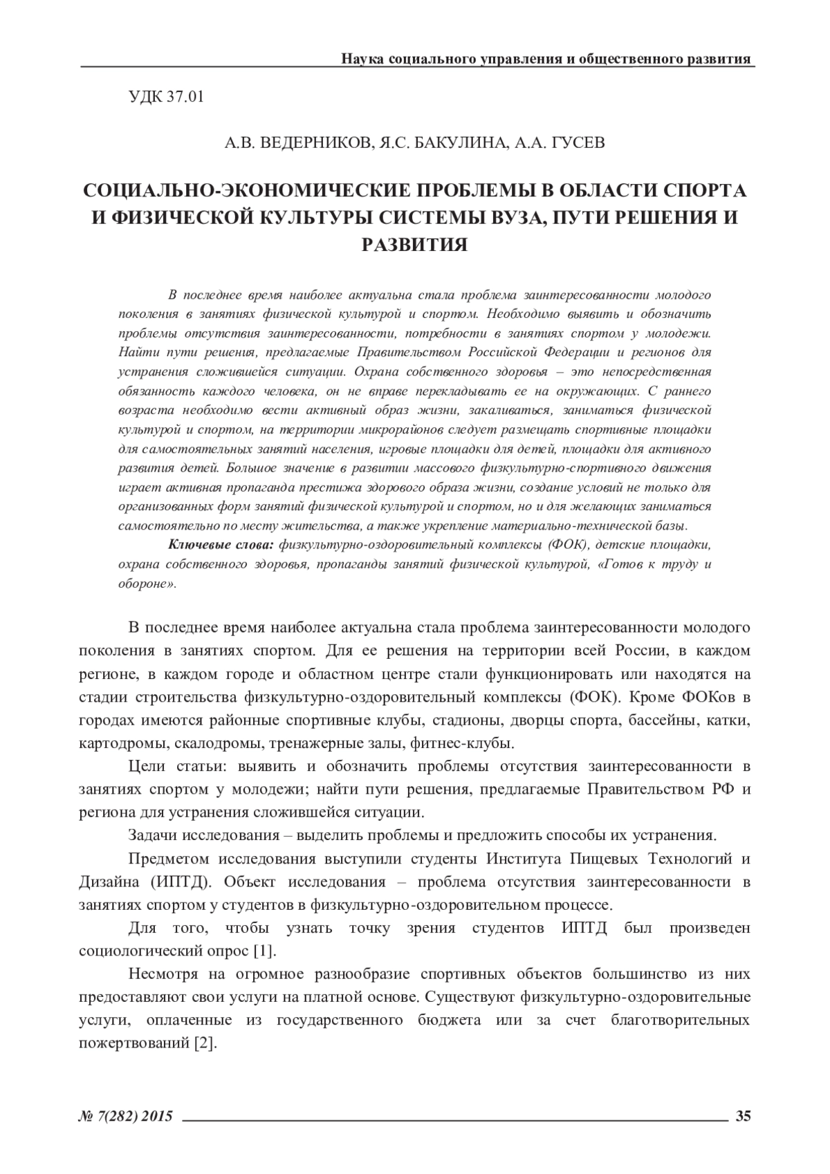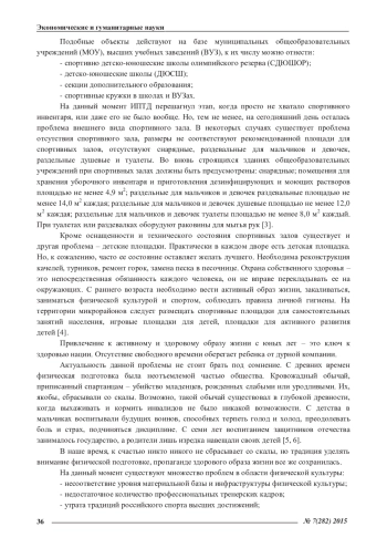В последнее время наиболее актуальна стала проблема заинтересованности молодого поколения в занятиях физической культурой и спортом. Необходимо выявить и обозначить проблемы отсутствия заинтересованности, потребности в занятиях спортом у молодежи. Найти пути решения, предлагаемые Правительством Российской Федерации и регионов для устранения сложившейся ситуации. Охрана собственного здоровья – это непосредственная обязанность каждого человека, он не вправе перекладывать ее на окружающих. С раннего возраста необходимо вести активный образ жизни, закаливаться, заниматься физической культурой и спортом, на территории микрорайонов следует размещать спортивные площадки для самостоятельных занятий населения, игровые площадки для детей, площадки для активного развития детей. Большое значение в развитии массового физкультурно-спортивного движения играет активная пропаганда престижа здорового образа жизни, создание условий не только для организованных форм занятий физической культурой и спортом, но и для желающих заниматься самостоятельно по месту жительства, а также укрепление материально-технической базы