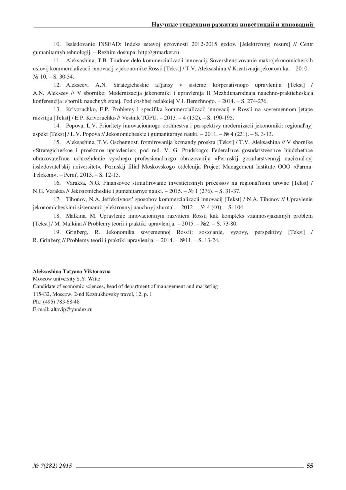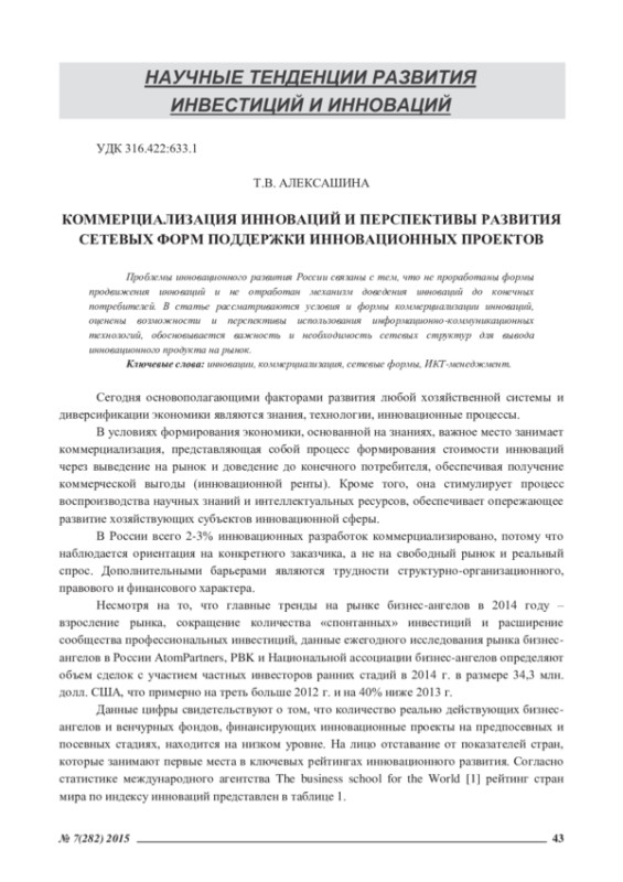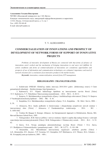 11. Алексашина, T.B. Трудное дело коммерциализации инноваций. Совершенствование макроэкономических условий коммерциализации инноваций в экономике России /Т.В. Алексашина//Креативная экономика. -2010. -№ 10. -С. 30-34. EDN: MVQXGV