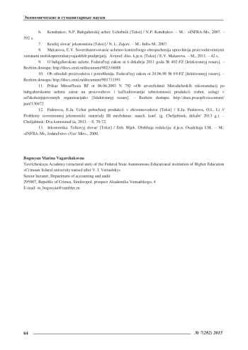 12. Федорова, Е.Я. Учет побочной продукции в животноводстве [Текст] / Е.Я. Федорова, О.Л. Ли // Проблемы современной экономики: материалы III междунар. науч. конф. (г. Челябинск, декабрь 2013 г.). - Челябинск: Два комсомольца, 2013. - С. 70-72. EDN: SWKHVL