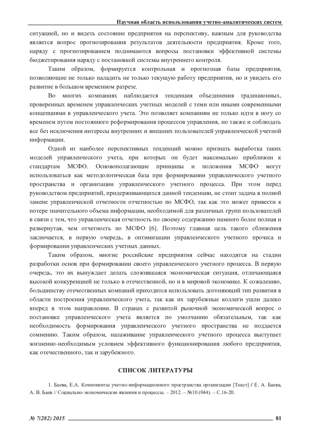 1. Баева, Е.А. Компоненты учетно-информационного пространства организации [Текст] / Е. А. Баева, А. В. Баев // Социально-экономические явления и процессы. - 2012. - №10 (044). - С.16-20. EDN: PZRQUB
